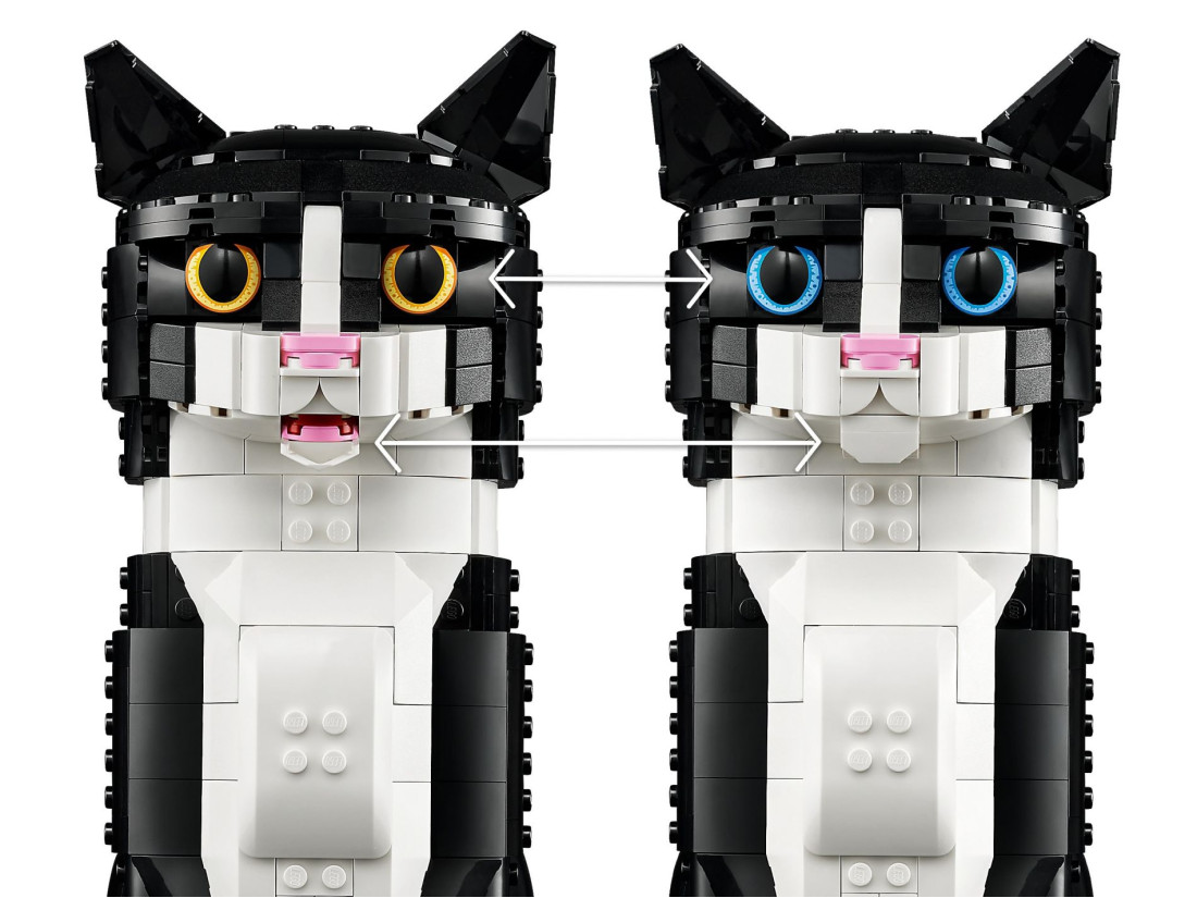 Насолоджуйтесь захоплюючим творчим проектом із набором для складання LEGO® Ideas Чорно-білий Кіт (21349) для дорослих. Ідеальний подарунок для любителів кішок або приємний сюрприз для себе, ця реалістична модель чорно-білого кота пропонує унікальний та гіпоалергенний спосіб додати котячий шарм у ваш інтер'єр. У наборі є можливість вибрати жовті або блакитні очі, відкриту або закриту пащу, а також регулювати вуха, лапи та хвіст для різних грайливих поз.