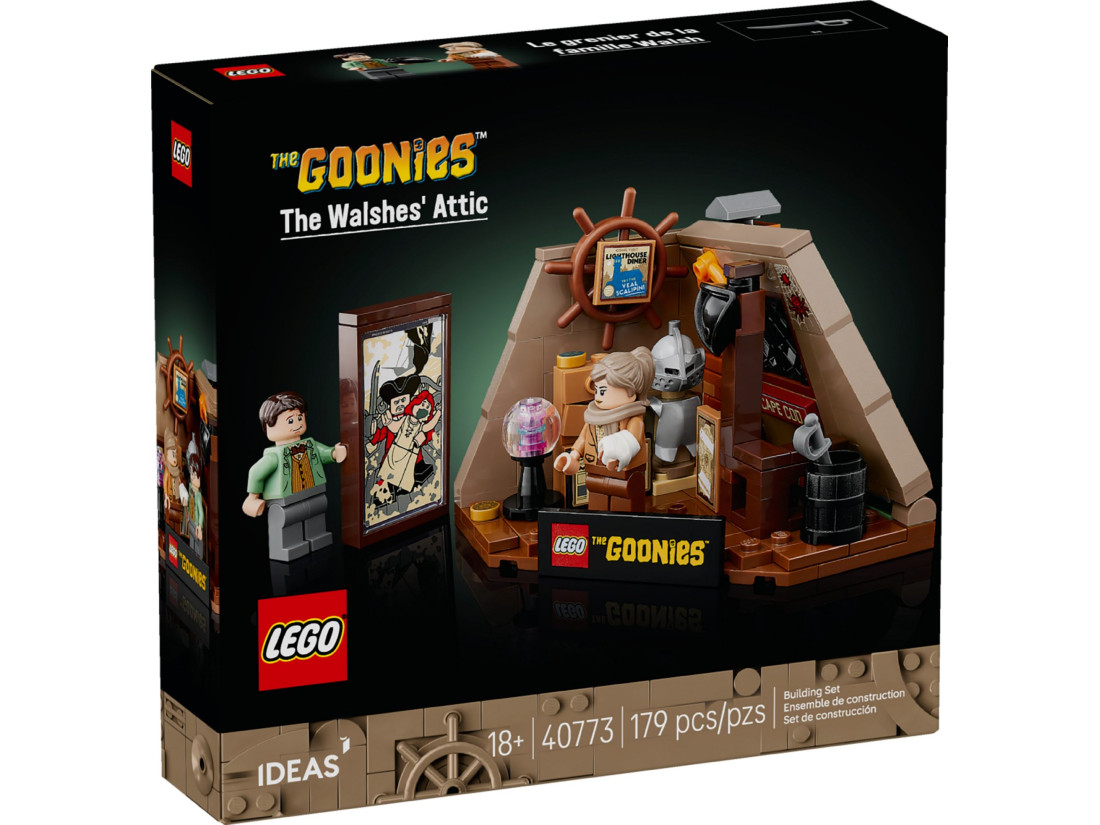 Набір LEGO IDEAS «Горище Волшів» (40773) переносить до ключового епізоду культової пригодницької стрічки The Goonies: на горищі родини Волш знаходять стару карту, що запускає низку подій. Модель відтворює тісне приміщення з похилим дахом і наповнює його характерними деталями з фільму: потерті скрині та ящики, карту і паперові вирізки, старовинні артефакти й піратську атрибутику. Композицію задумано як невелику вітринну сцену, яку зручно збирати, розглядати й поєднувати з іншими моделями.
