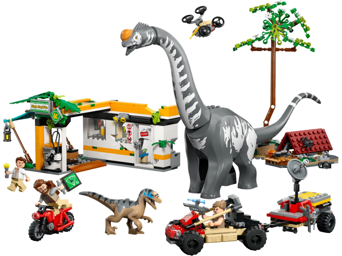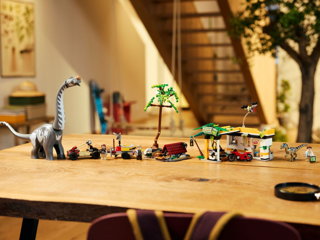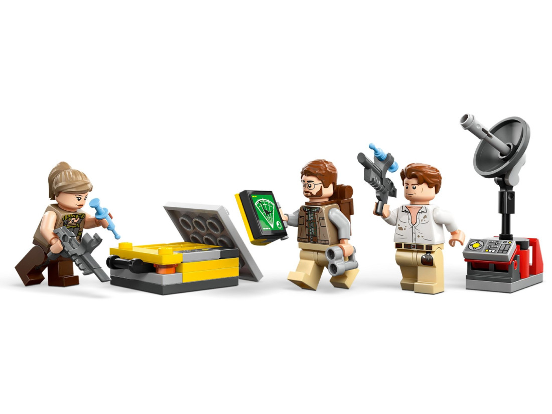 Транспорт і обладнання формують повноцінну експедицію: позашляховик із причепом перевозить спорядження, зарядна станція обслуговує техніку, а кейс із трьома шприцами стане в пригоді для ветеринарних процедур. До комплекту також входять мотоцикл, збірний дрон і табірна зона з деревом, що падає, для постановки напружених сцен. 582 деталі заохочують складання функціональних моделей та експерименти з конфігураціями. Розмір зарядної станції: висота 10 см, ширина 21 см, глибина 16 см.
