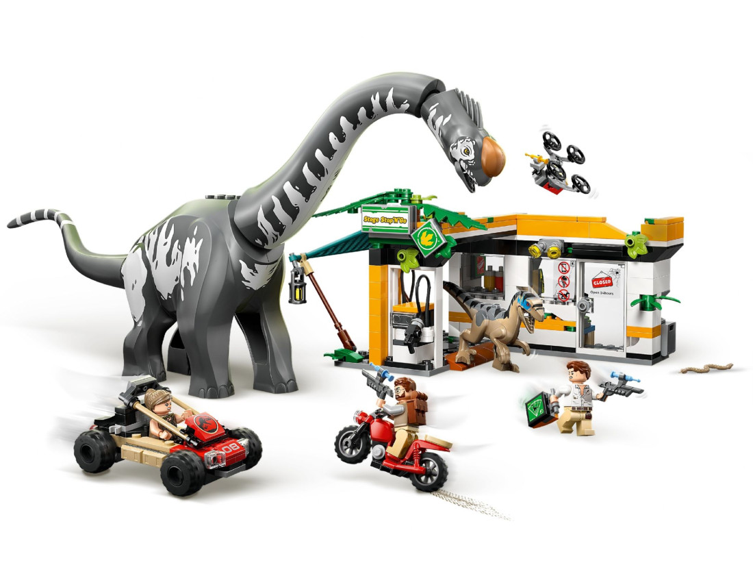 - Дві фігурки динозаврів: титанозавр (рухомі шия, голова та хвіст) і велоцираптор (паща, що відкривається).