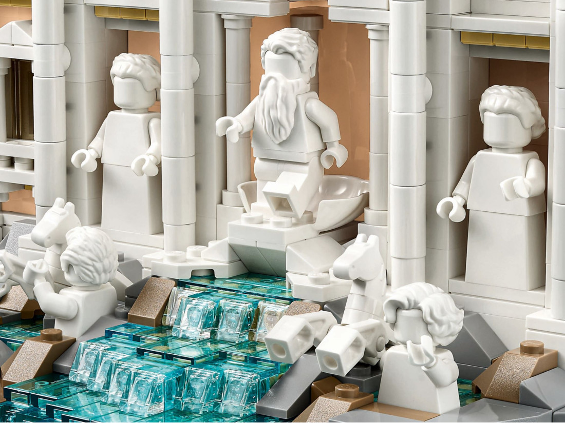 - Автентична деталізована модель – Насолоджуйтеся точною реконструкцією фасаду Palazzo Poli та іконічних статуй Океану у його ракетниці, Достатку та Здоров'я у формі мініфігур. Також включені гіпокампи та тритони у воді, маленький фонтан «Закоханих» та табличка з назвою, що завершують вражаючу модель фонтану Треві.