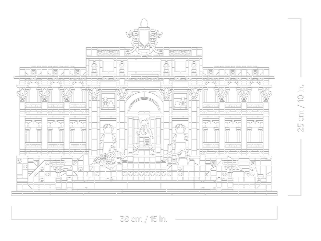 - Розміри моделі – Набір складається з 1,880 деталей, а зібрана модель фонтану Треві має розміри понад 25 см заввишки, 38 см завширшки та 18 см завглибшки, що робить її ідеальною для демонстрації та прикраси робочого столу.