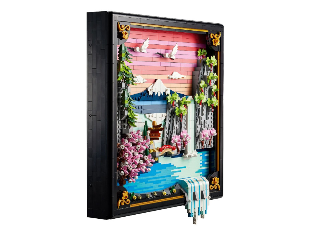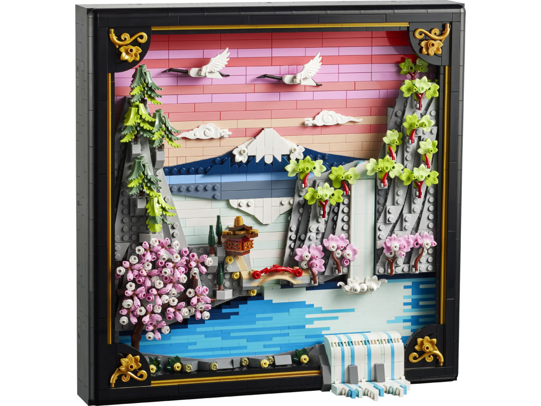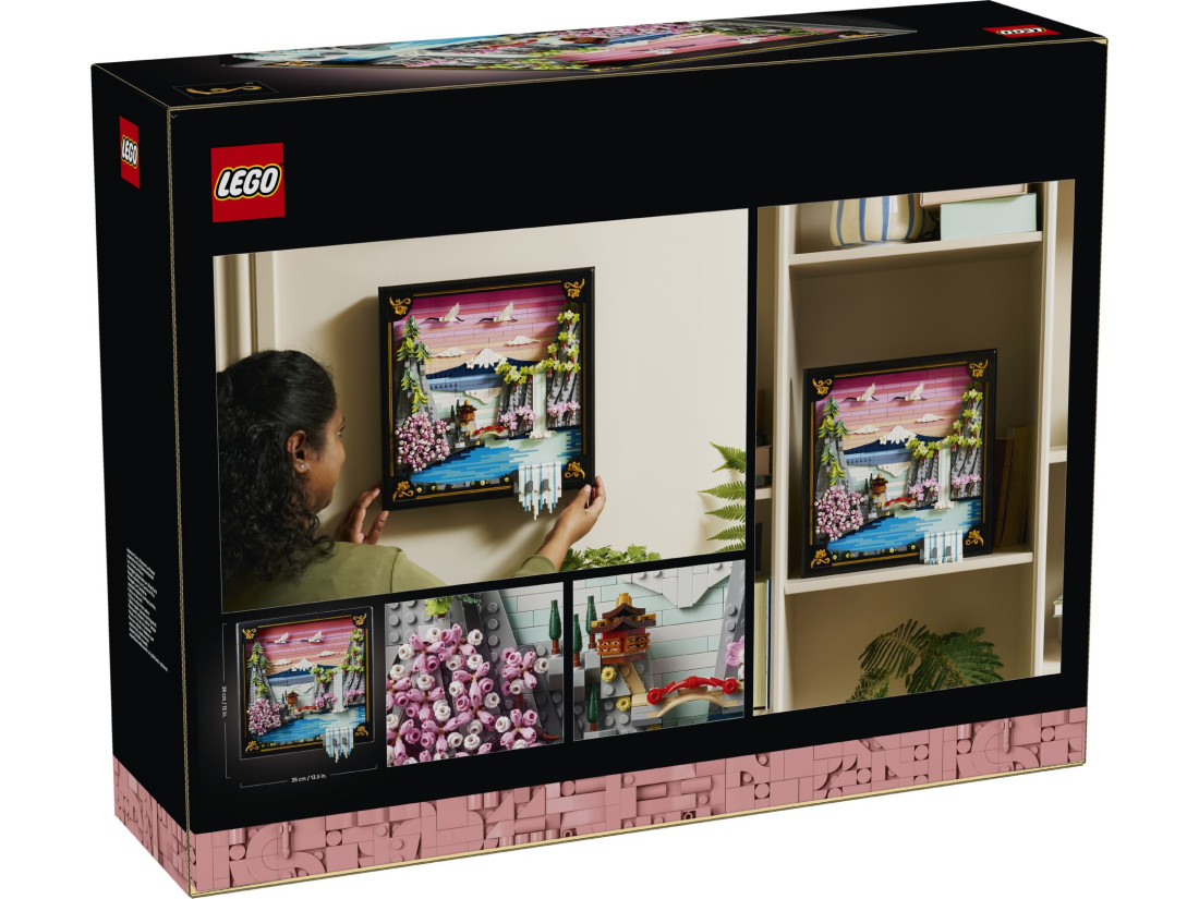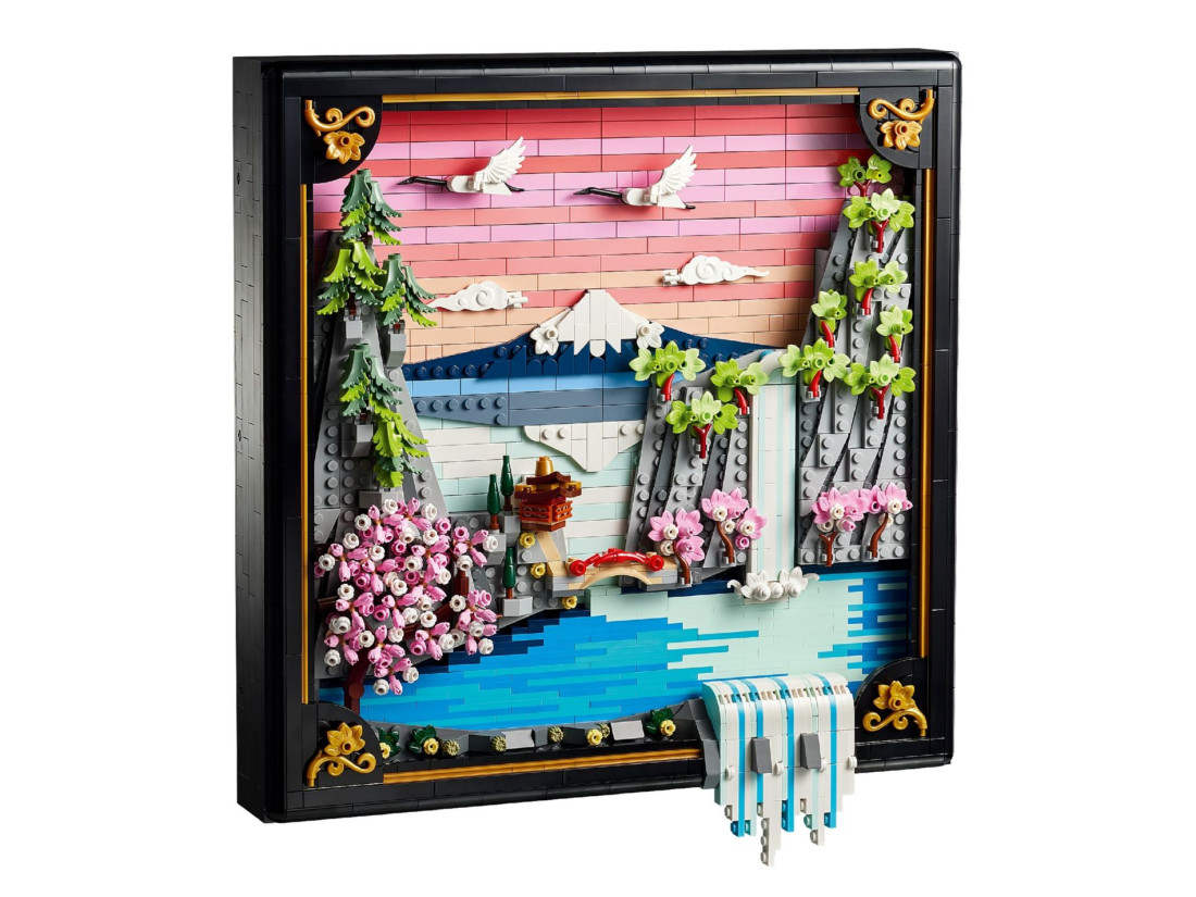 LEGO ART Пейзаж із квітучою японською сакурою (31218) — об’ємна композиція, натхненна природою та традиційним мистецтвом Ukiyo‑e, що передає весну в Японії. Рельєфне панно зображає Фудзі, чайний будиночок та вишуканий міст; на передньому плані струмує водоспад, частина потоків виходить за межі рами, над водою ширяють японські журавлі. Сцену доповнюють три характерні дерева — сакура, клен Санґо‑Каку та японська сосна — в обрамленні чорної рами з лаковою фактурою та золотистими акцентами.