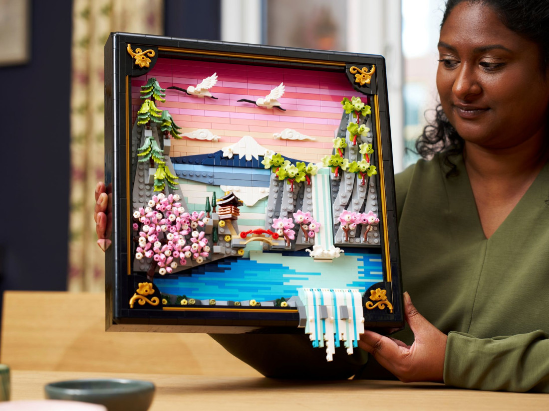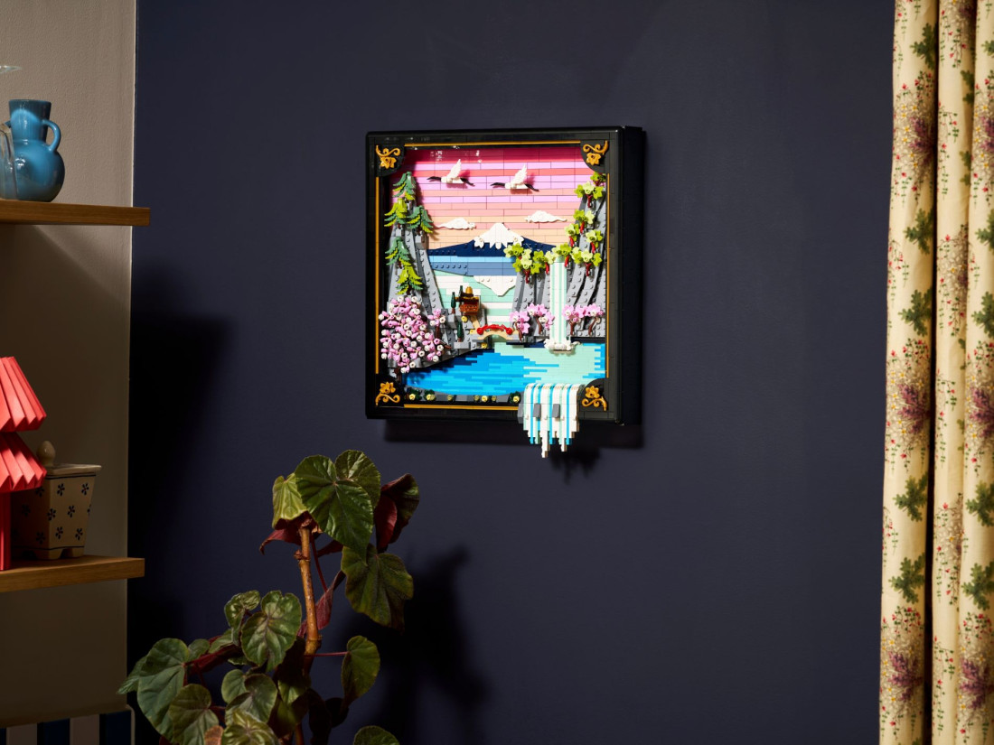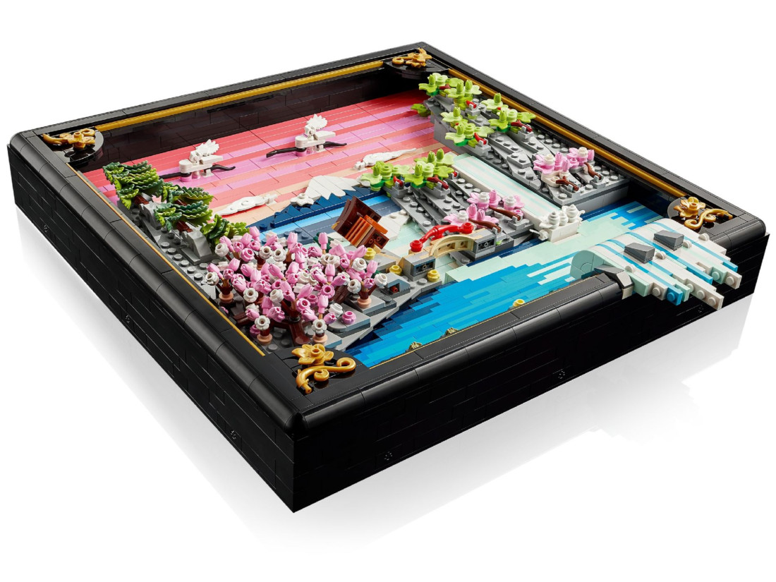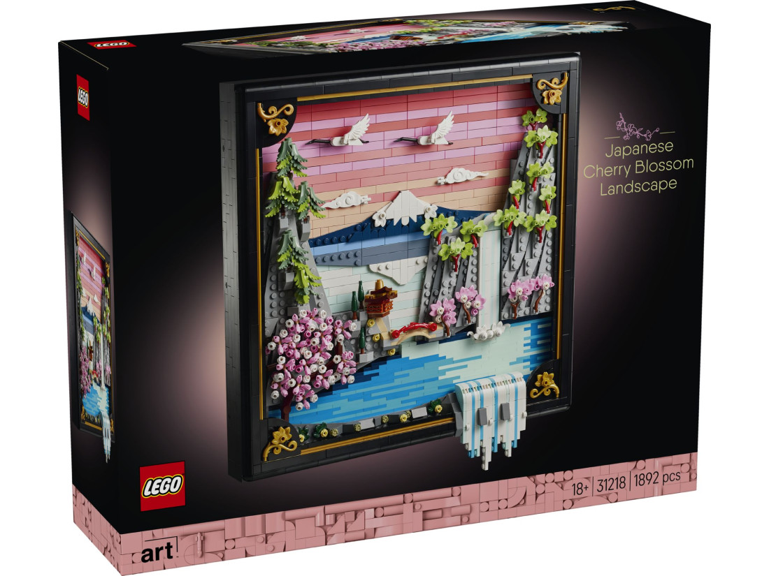 LEGO ART Пейзаж із квітучою японською сакурою (31218) — об’ємна композиція, натхненна природою та традиційним мистецтвом Ukiyo‑e, що передає весну в Японії. Рельєфне панно зображає Фудзі, чайний будиночок та вишуканий міст; на передньому плані струмує водоспад, частина потоків виходить за межі рами, над водою ширяють японські журавлі. Сцену доповнюють три характерні дерева — сакура, клен Санґо‑Каку та японська сосна — в обрамленні чорної рами з лаковою фактурою та золотистими акцентами.