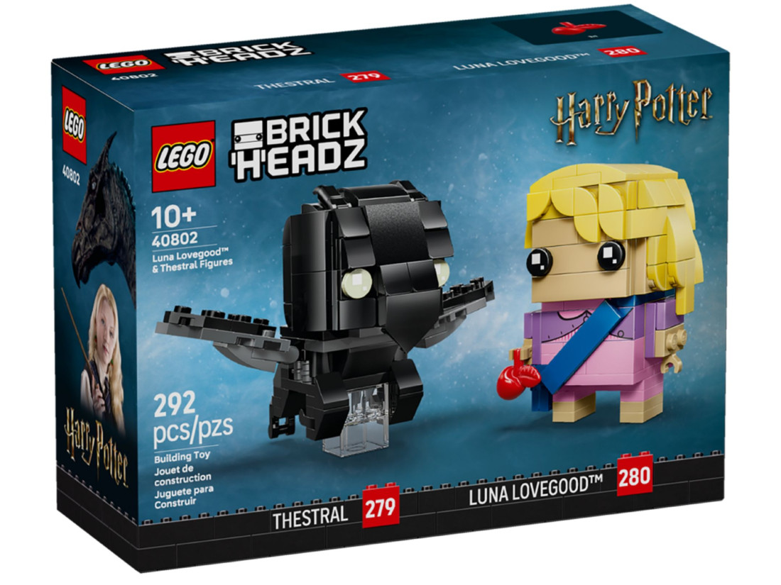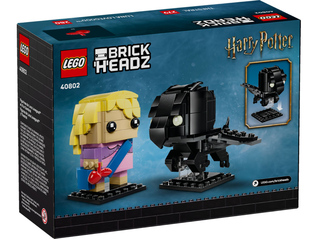Набір LEGO BRICKHEADZ «Луна Лавгуд і фестрал» (40802) — колекційна збірка зі всесвіту LEGO HARRY POTTER з 292 елементів. Всередині — стилізовані моделі Луни Лавгуд і крилатого фестрала, виконані у фірмовій кубічній манері серії. Акцент зроблено на впізнаваних рисах: акуратне вбрання героїні та аксесуар у вигляді яблука, а фестрал переданий у динаміці «у польоті». Композицію розраховано на демонстрацію на полиці та акуратні ігрові сценки.