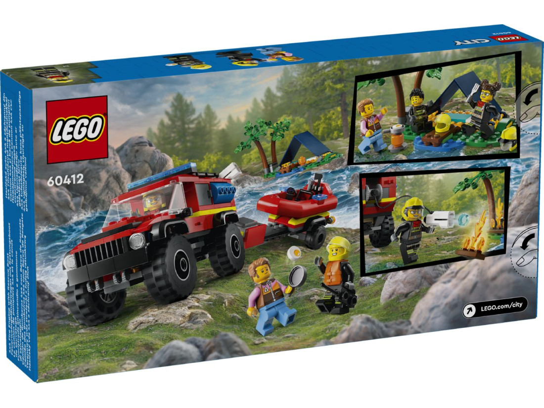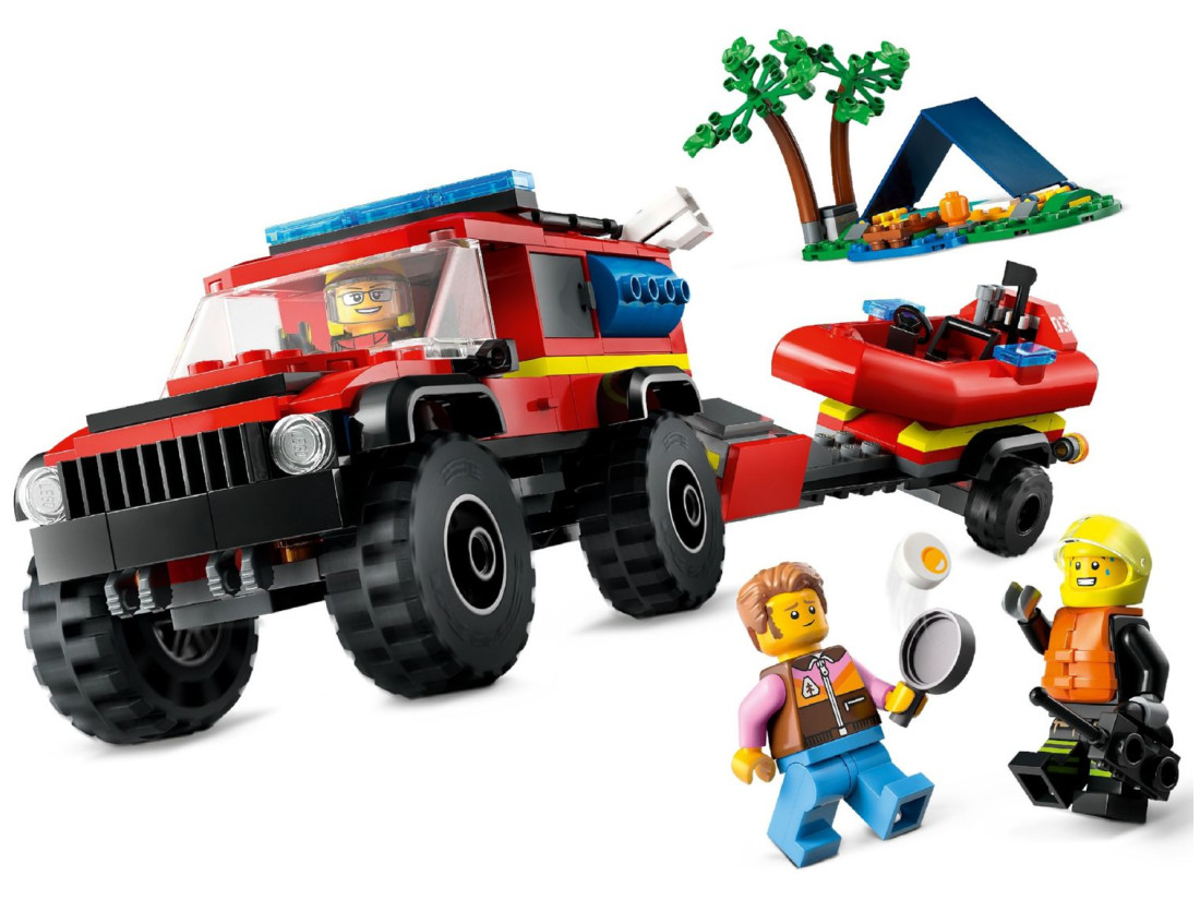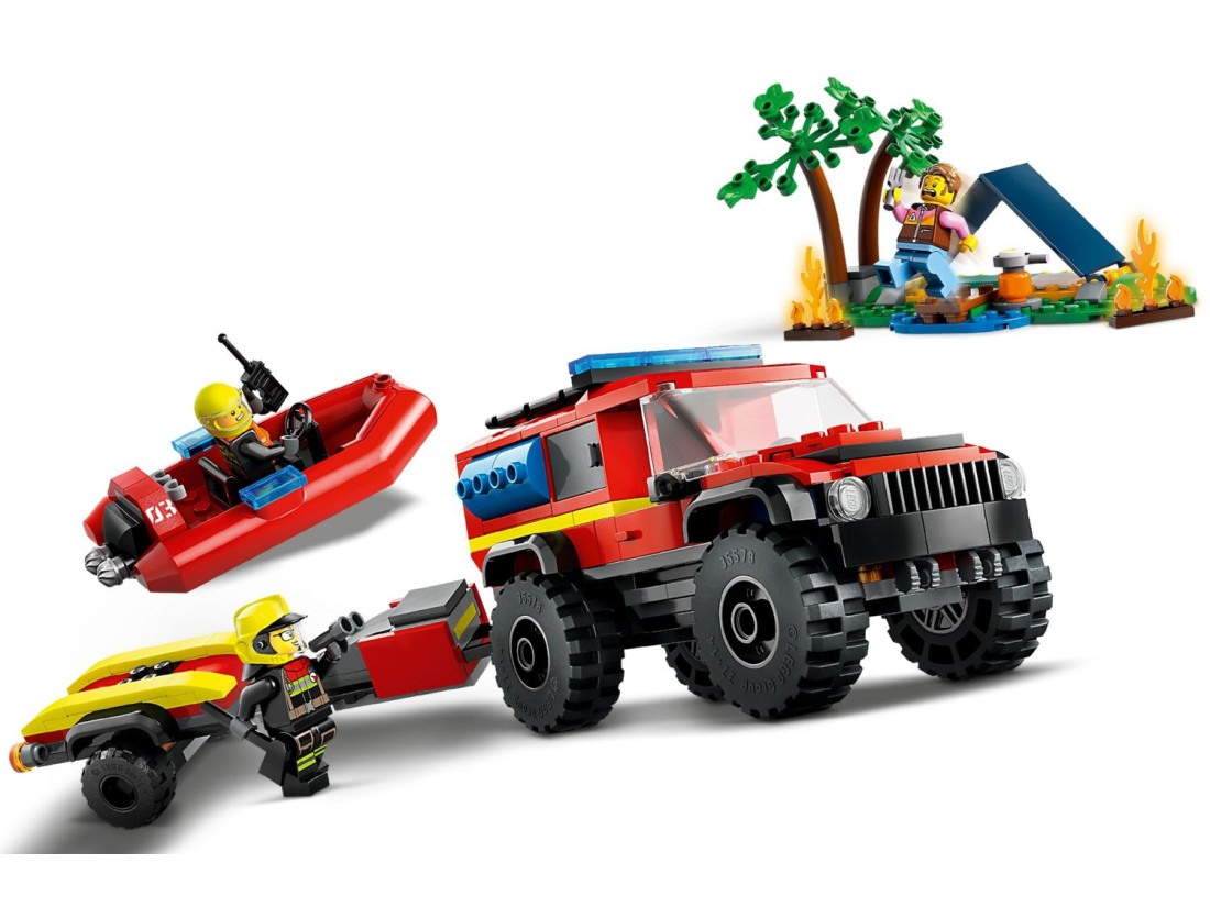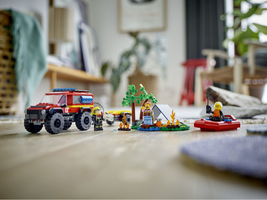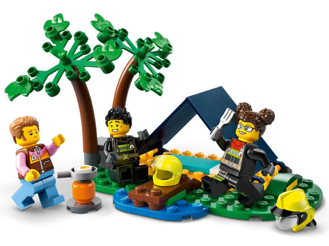 - Захоплюючий рятувальний набір – Включає пожежний позашляховик, рятувальний човен, причіп та сцену кемпінгу з багаттям, а також 2 мініфігурки (пожежного та туриста).
