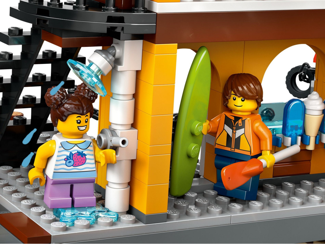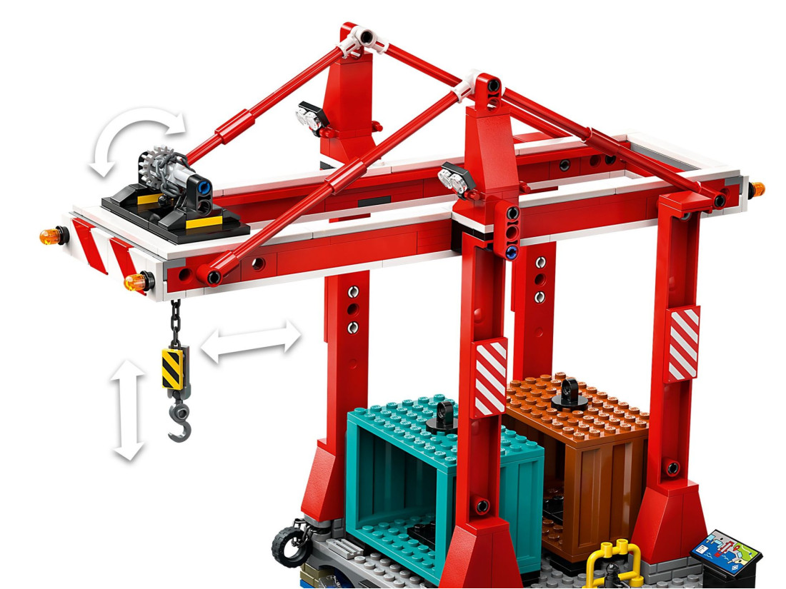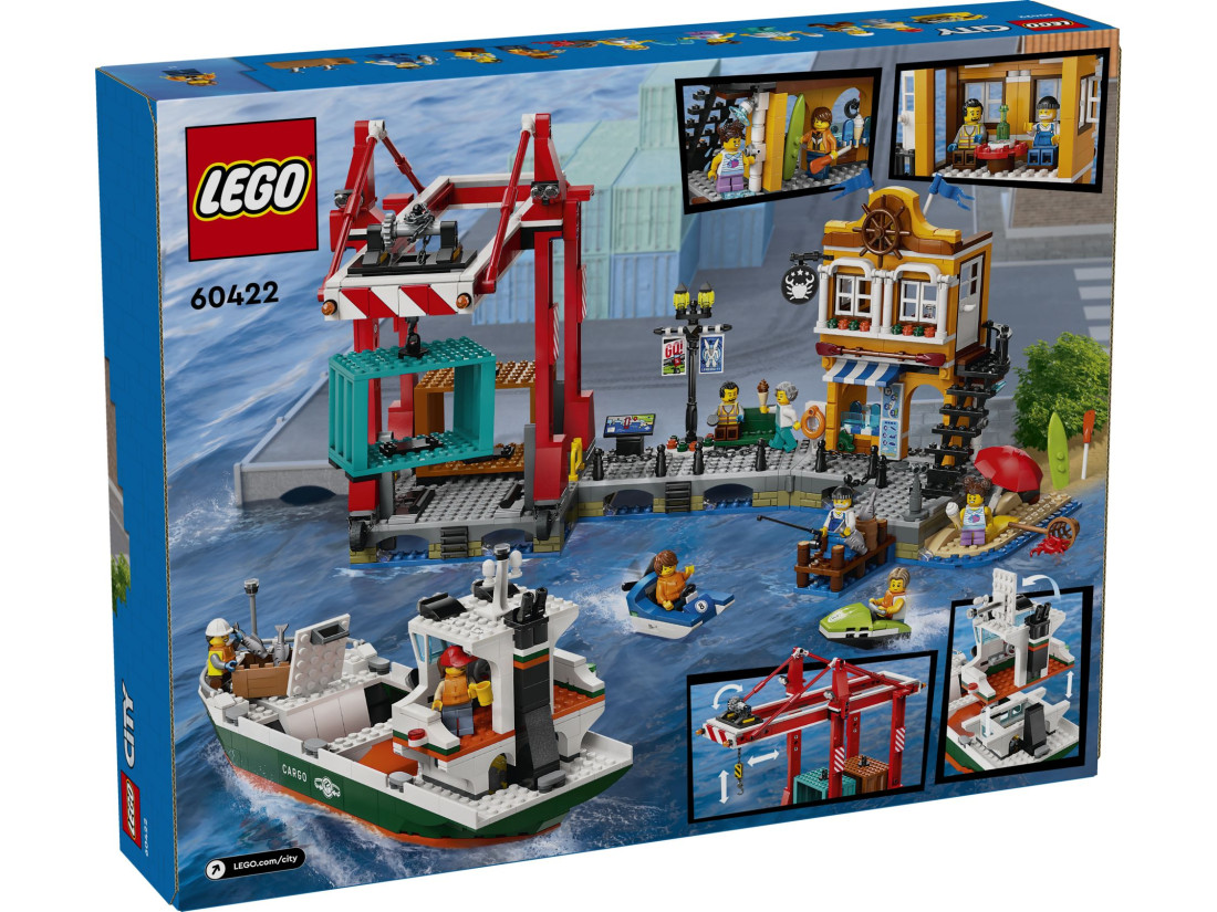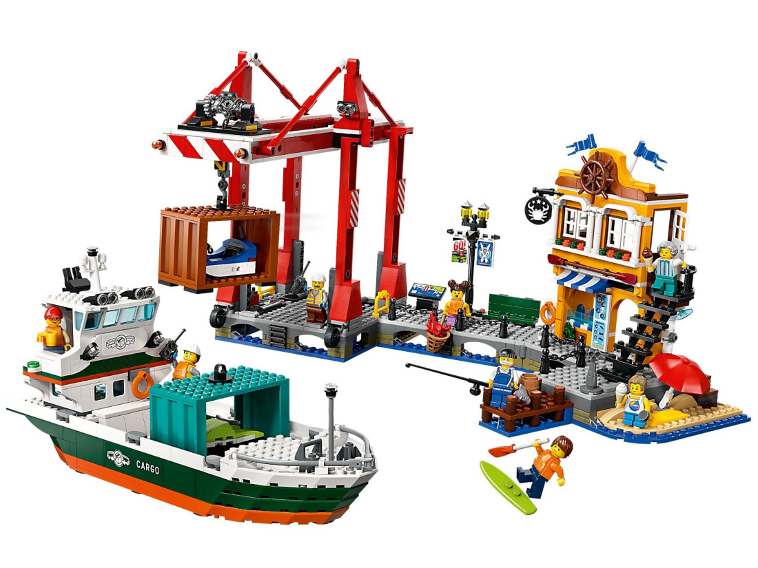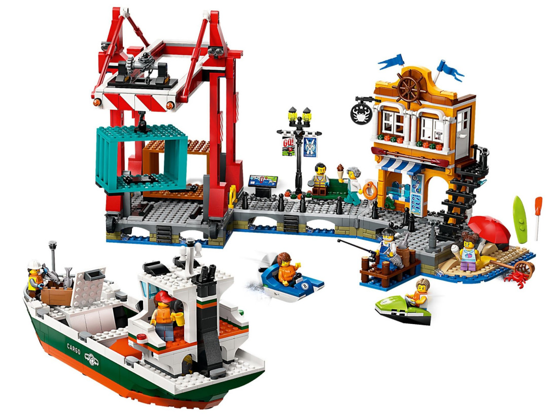 Комплексне складання. Включає деталізований вантажний корабель, що працює контейнерний кран, гавань з магазином та рестораном, водний скутер, байдарку та 8 мініфігурок для динамічної гри.