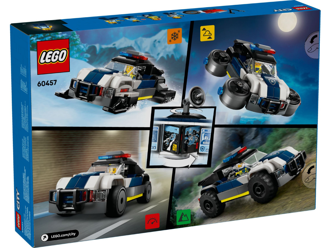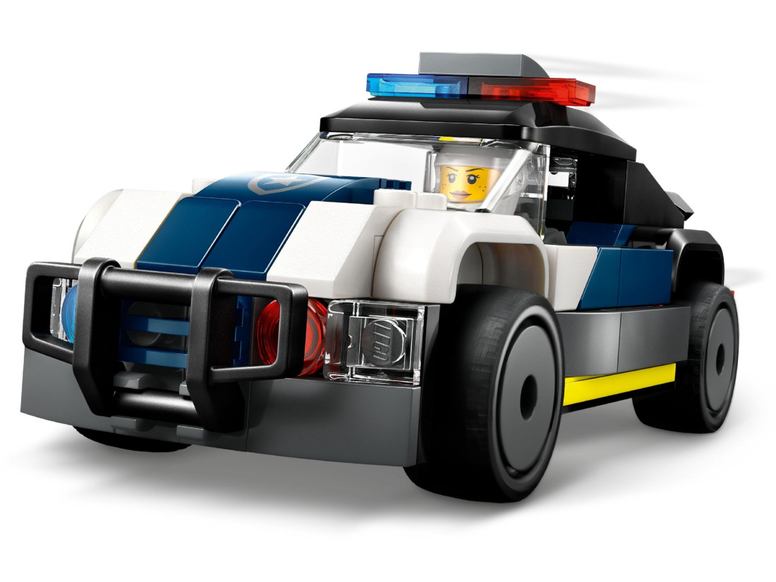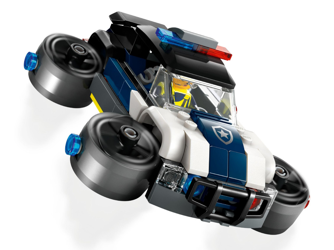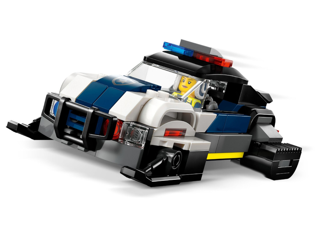 До комплекту входять поліцейський автомобіль і набір змінних модулів для руху по асфальту, бездоріжжю та снігу, а також елементи для завдань у повітрі. Для обслуговування передбачено візок з інструментами та аксесуарами, а компанію в грі складуть мініфігурки начальника поліції, водія та двох механіків. Рекомендований вік — від 6 років. У наборі 489 деталей. Розміри зібраного гаража: висота 11 см, ширина 42 см, глибина 21 см.