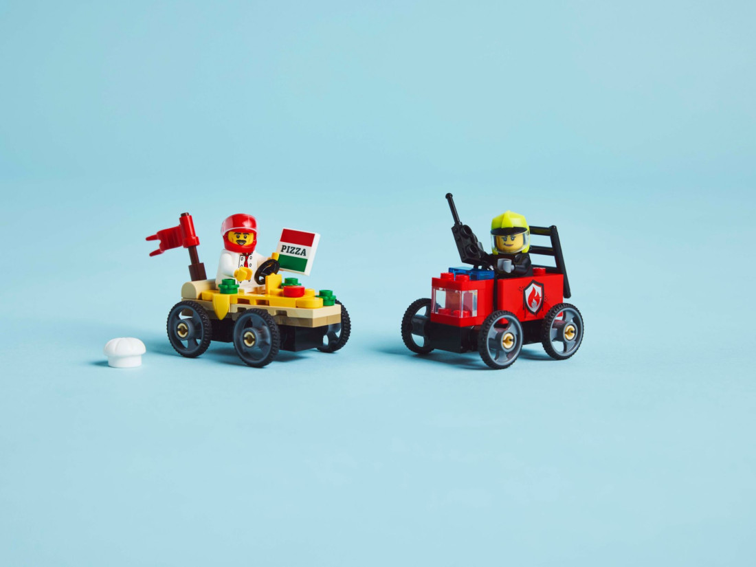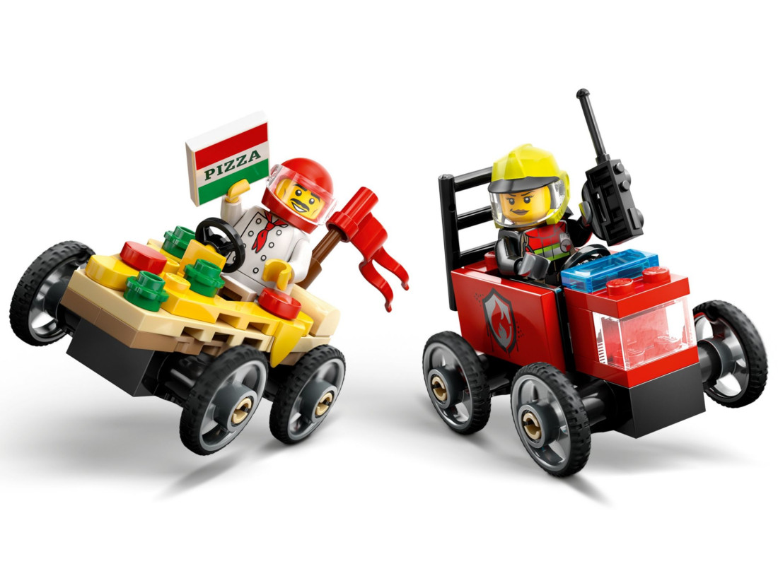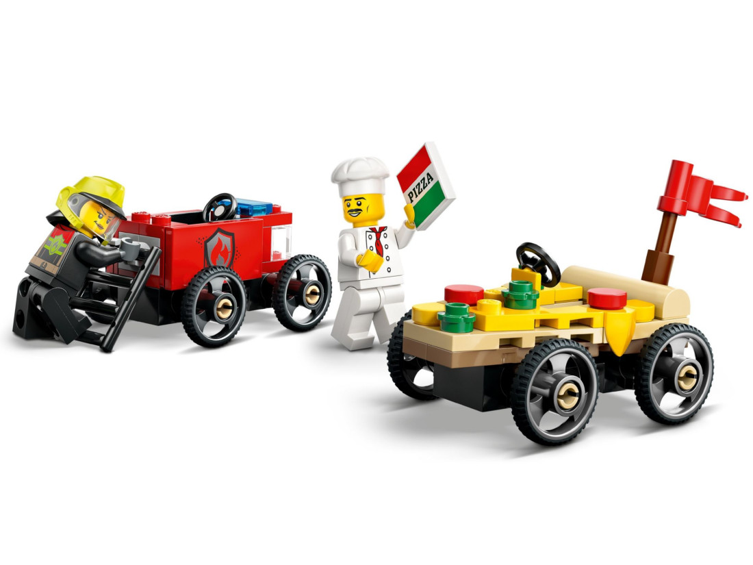 - Дві гоночні машини – Набір включає дві гоночні машини: одну у вигляді шматочка піци та іншу – пожежну машину, що додає різноманітності та веселощів у ігрові сценарії.