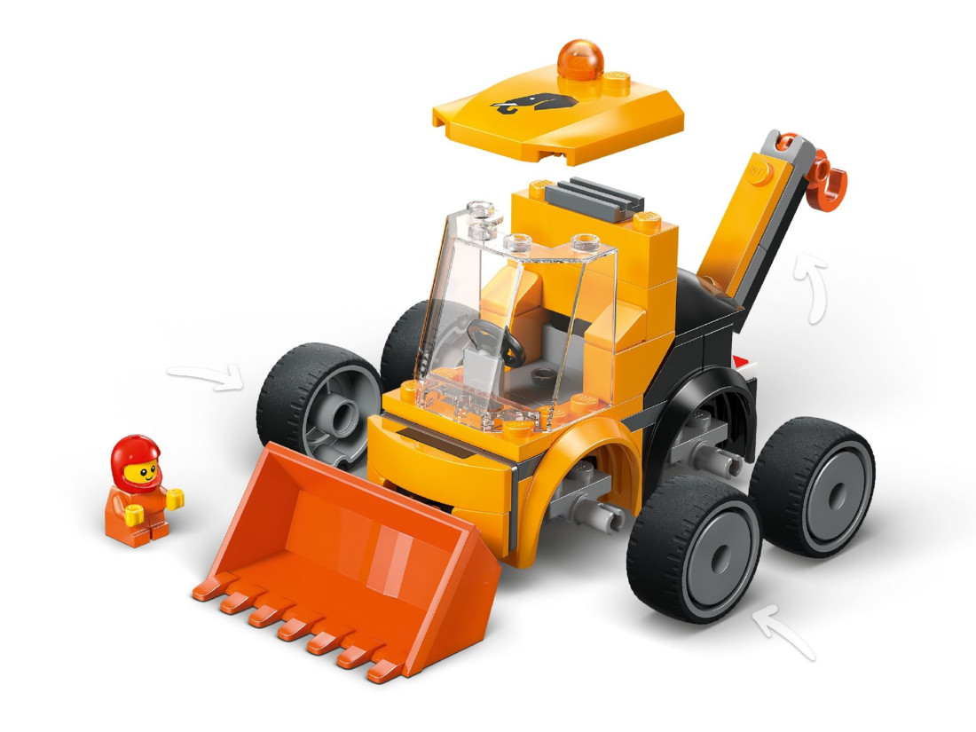 Навантажувач оснащений міцними гумовими колесами, відкритою кабіною оператора та функціональним фронтальним ковшем для перевезення сипких матеріалів. У задній частині розташована кранова стріла з гаком — її зручно використовувати для підйому невеликих вантажів і обладнання. У набір входить мініфігурка, яку можна посадити в кабіну, змінюючи сценарії та ролі. Габарити моделі: близько 6 см у висоту, 15 см у довжину і 5 см у ширину — легко вміщується в руку дитини та на полицю.