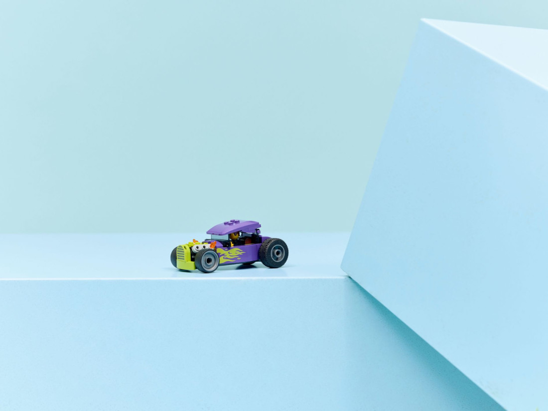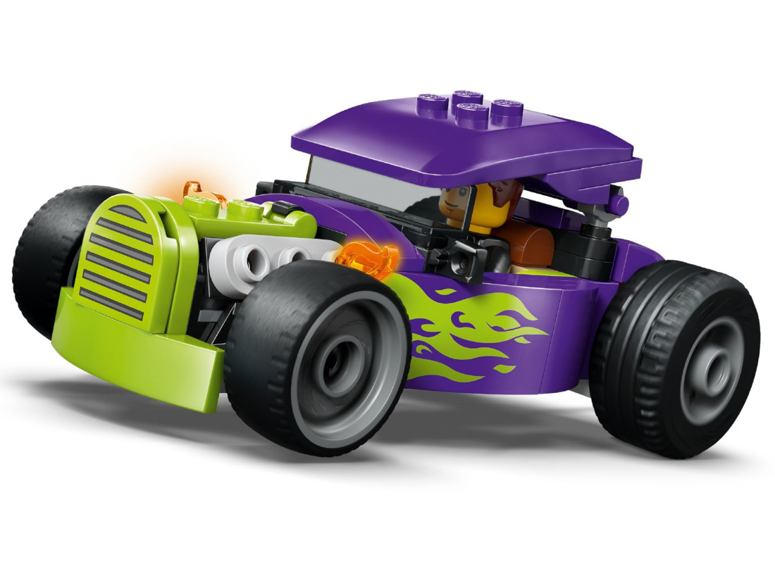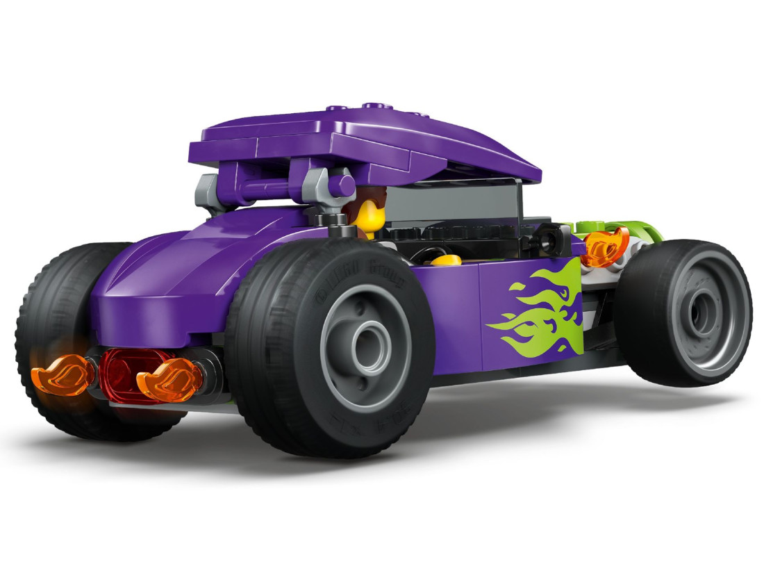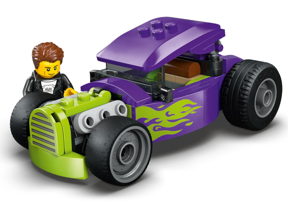 LEGO City — Хот-род (60485) — набір для дітей від 5 років, створений для сюжетних перегонів і швидких заїздів. Компактна модель класичного хот-роду поєднує яскравий зовнішній вигляд і просте складання. Кузов виконаний в ефектному фіолетовому кольорі з неоново‑зеленими вогняними візерунками; масивні задні колеса підкреслюють спортивний характер. Дах кабіни піднімається, всередині є місце для мініфігурки водія, якого можна посадити за кермо.