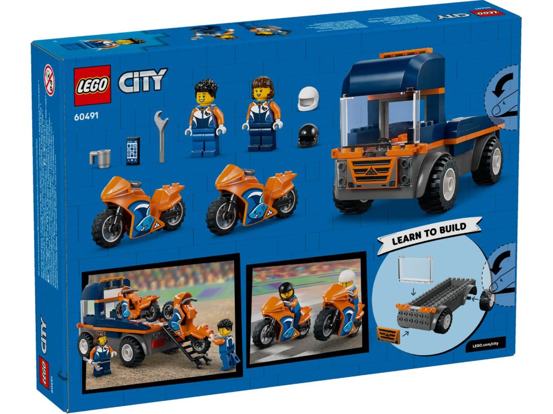 Діти можуть посадити персонажа в кабіну, доїхати до треку і за допомогою знімної рампи швидко вивантажити байки, вигадуючи власні змагання та тренувальні заїзди. Великі гумові шини та міцна конструкція витримують активну гру, а Стартовий кубик спрощує складання ключових елементів моделі, знижуючи поріг входу для новачків.