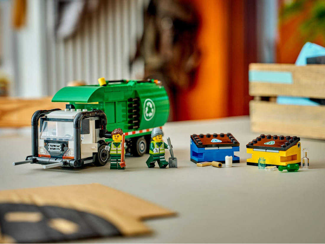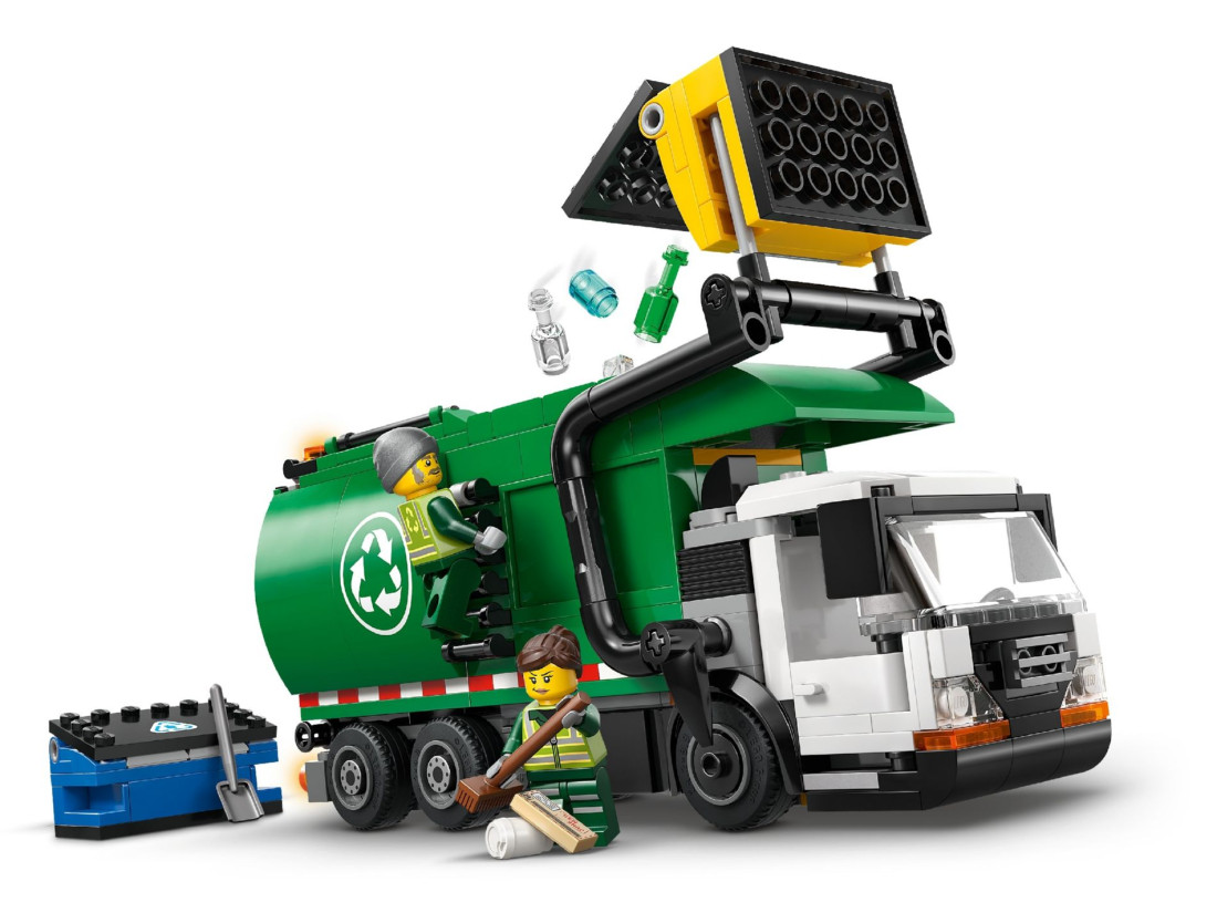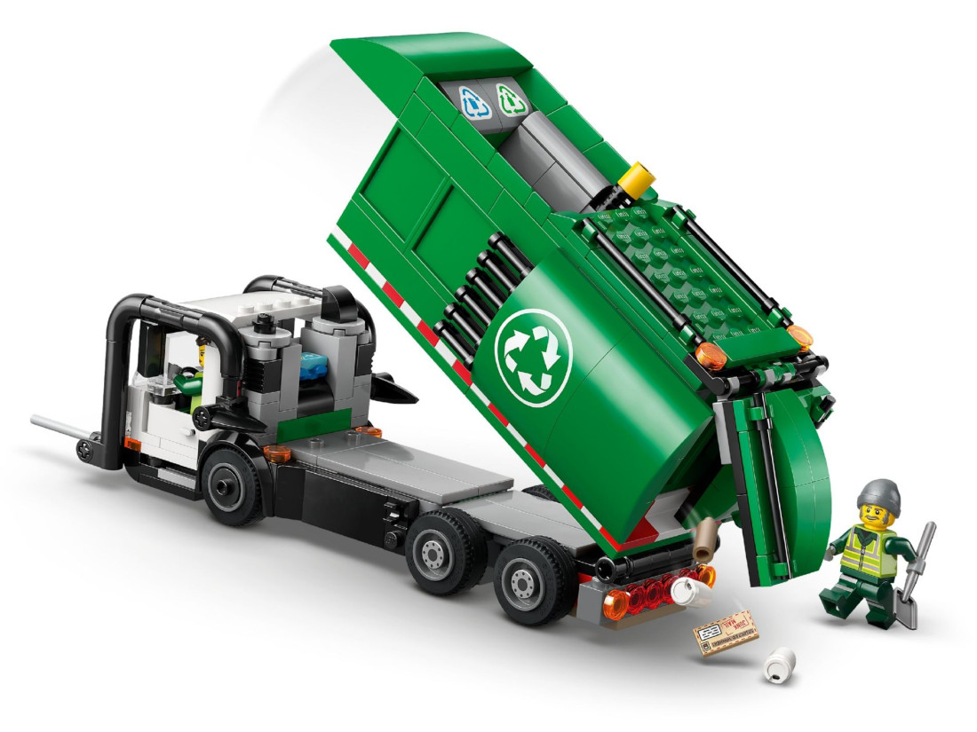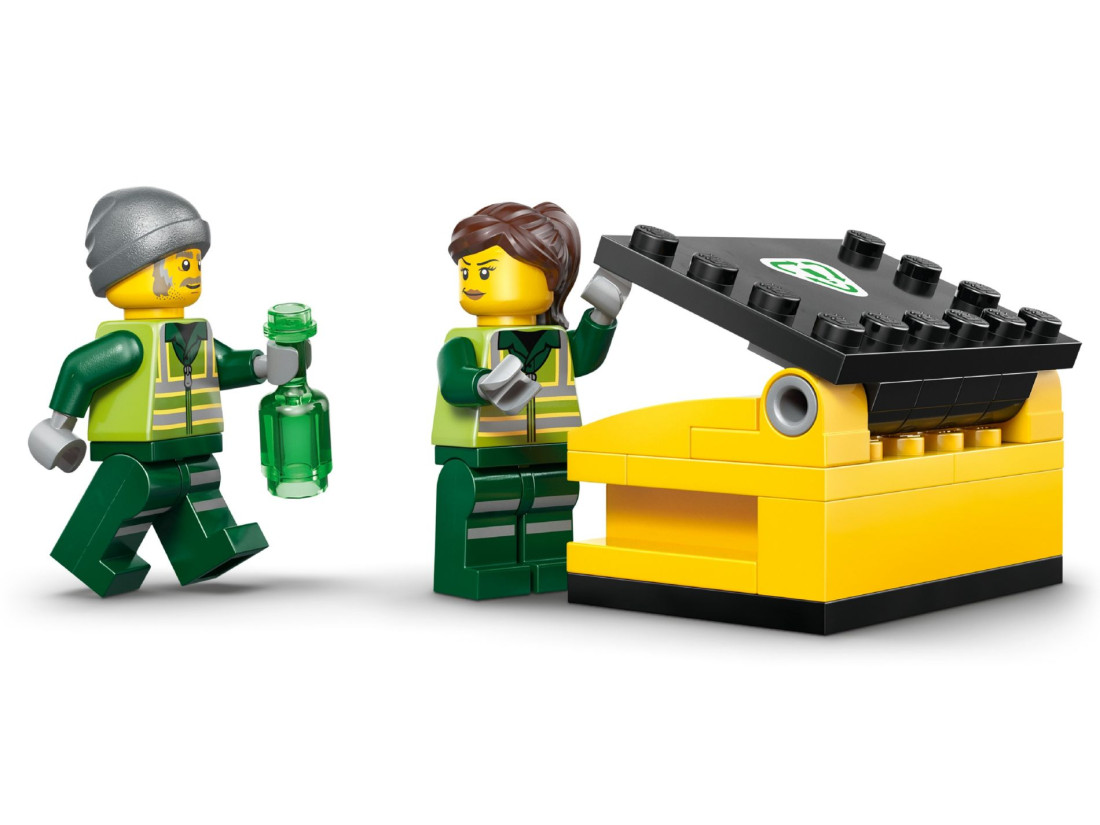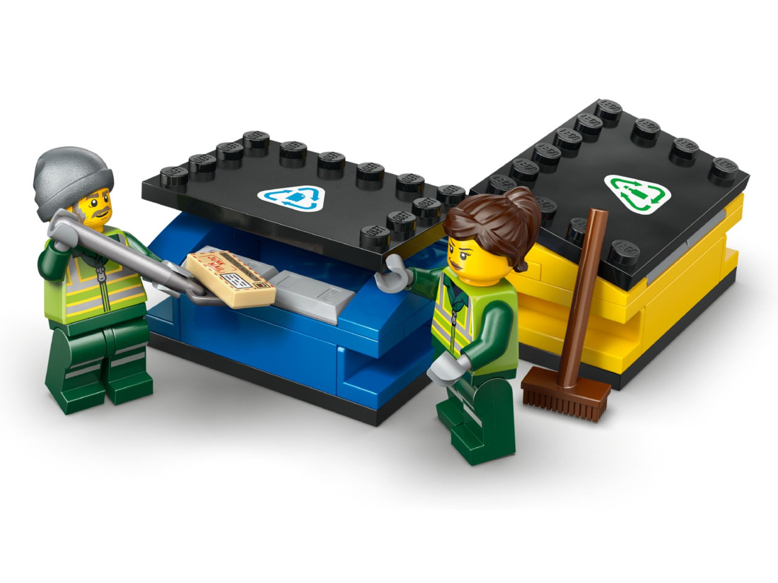 До набору входять мініфігурки водія та працівника комунальної служби, а також аксесуари: лопата, мітла та невеликі елементи сміття для сцен прибирання. Набір містить 434 деталі; розміри вантажівки: приблизно 9 × 23 × 8 см — цього достатньо, щоб поєднувати її з іншими міськими моделями та розігрувати правдоподібні сценарії роботи міської екосистеми.