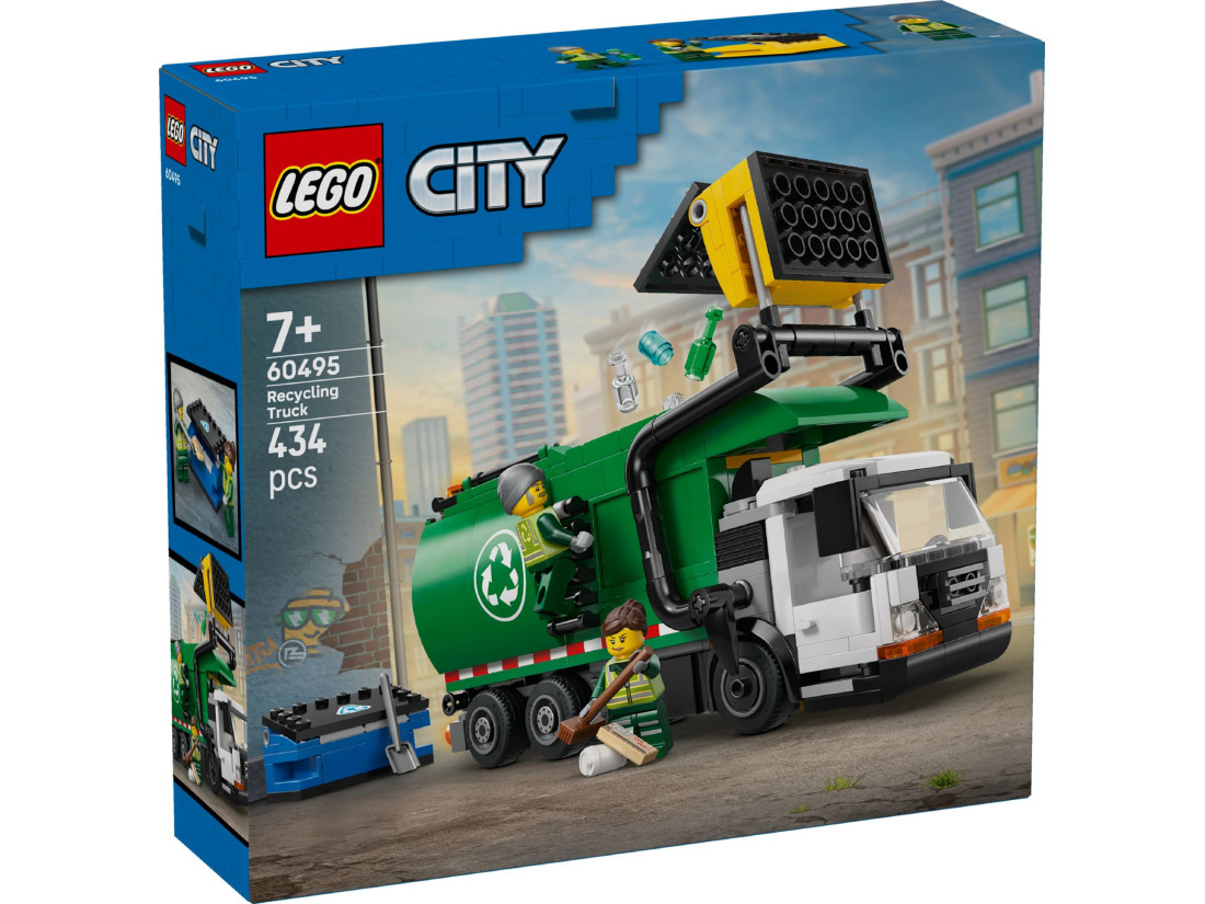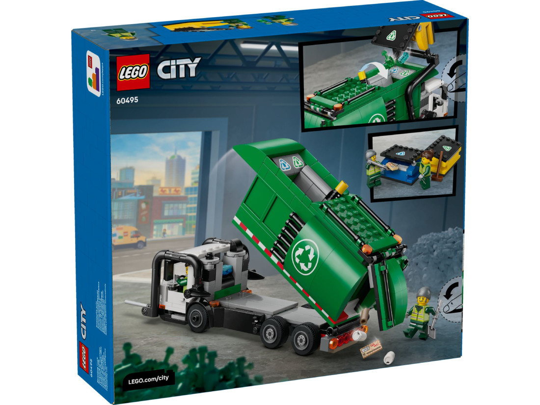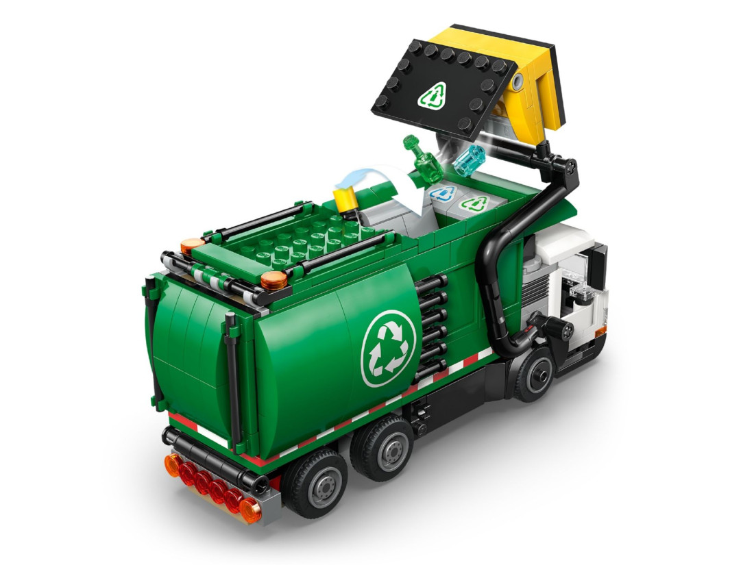 LEGO CITY Сміттєвоз (60495) — ігровий набір, який знайомить дітей від 7 років із процесом роздільного збирання та переробки відходів. Модель продумана для сюжетної гри: всередині кузова розміщений розділювач для скла та паперу, а боковий важіль піднімає та спорожнює два вуличні контейнери. Кабіна водія відкидається, відкриваючи деталь, що імітує електродвигун, на бортах є кріплення для інвентарю, а кузов піднімається, дозволяючи вивантажувати відсортоване сміття через одну з двох задніх стулок.