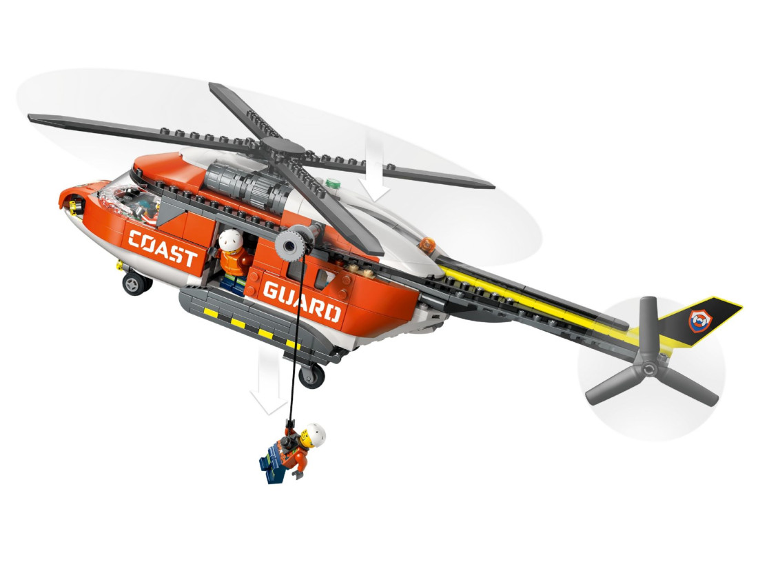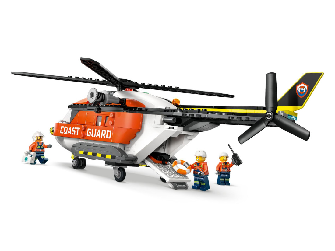 LEGO City Вертоліт берегової охорони (60503) — набір для дітей від 7 років про пошуково-рятувальні операції на воді. Велика модель у червоному забарвленні оснащена обертовими роторами, розсувними дверима та відкидною задньою рампою. Детально опрацьовані кабіна й фюзеляж роблять польоти правдоподібними, а робоча лебідка дає змогу опускати рятувальника до постраждалих. Рятувальна капсула відкривається для доступу всередину.