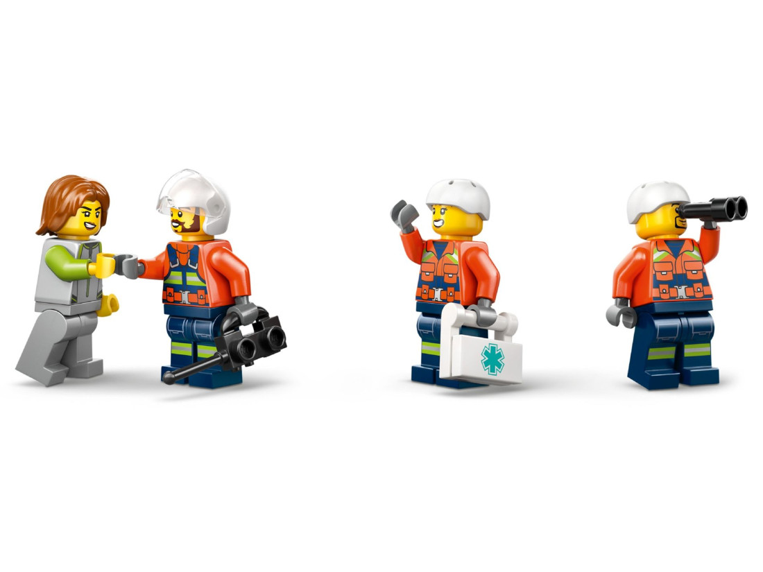 У комплекті мініфігурки пілота, цивільного та двох співробітників берегової охорони, а також фігурка акули. Аксесуари — аптечка, бінокль, рація та рятувальний круг — допомагають розігрувати тренування й операції. Усього 551 елемент; розміри моделі: висота 11 см, довжина 38 см, ширина 26 см. Конструкція сумісна з іншими наборами LEGO City і розрахована на активну гру.