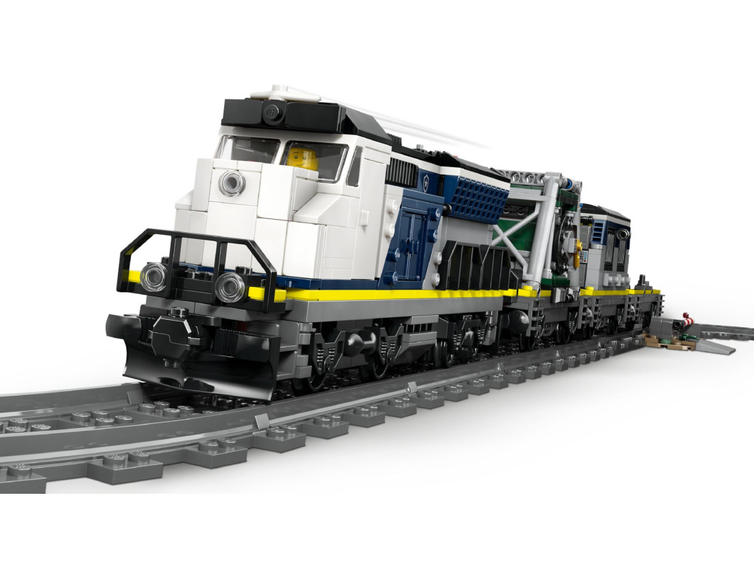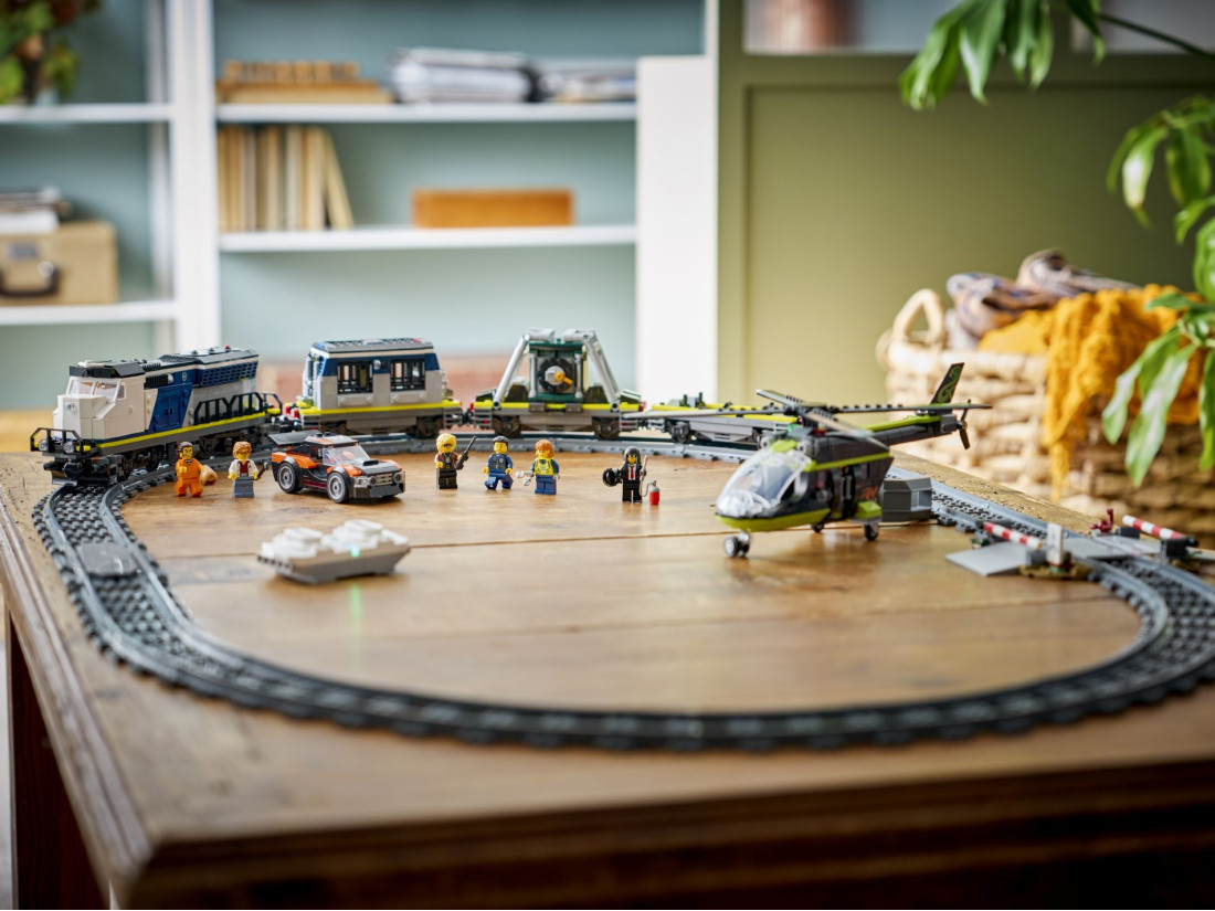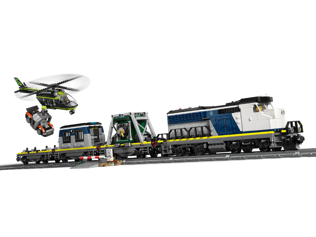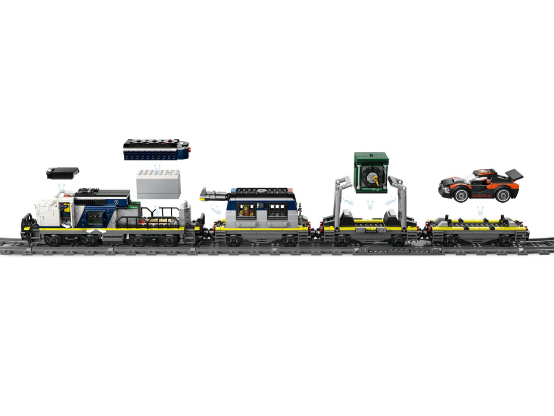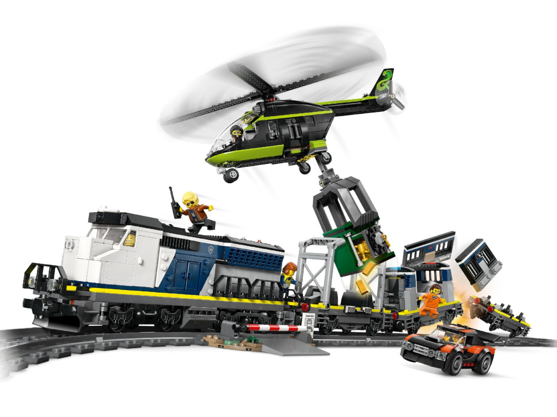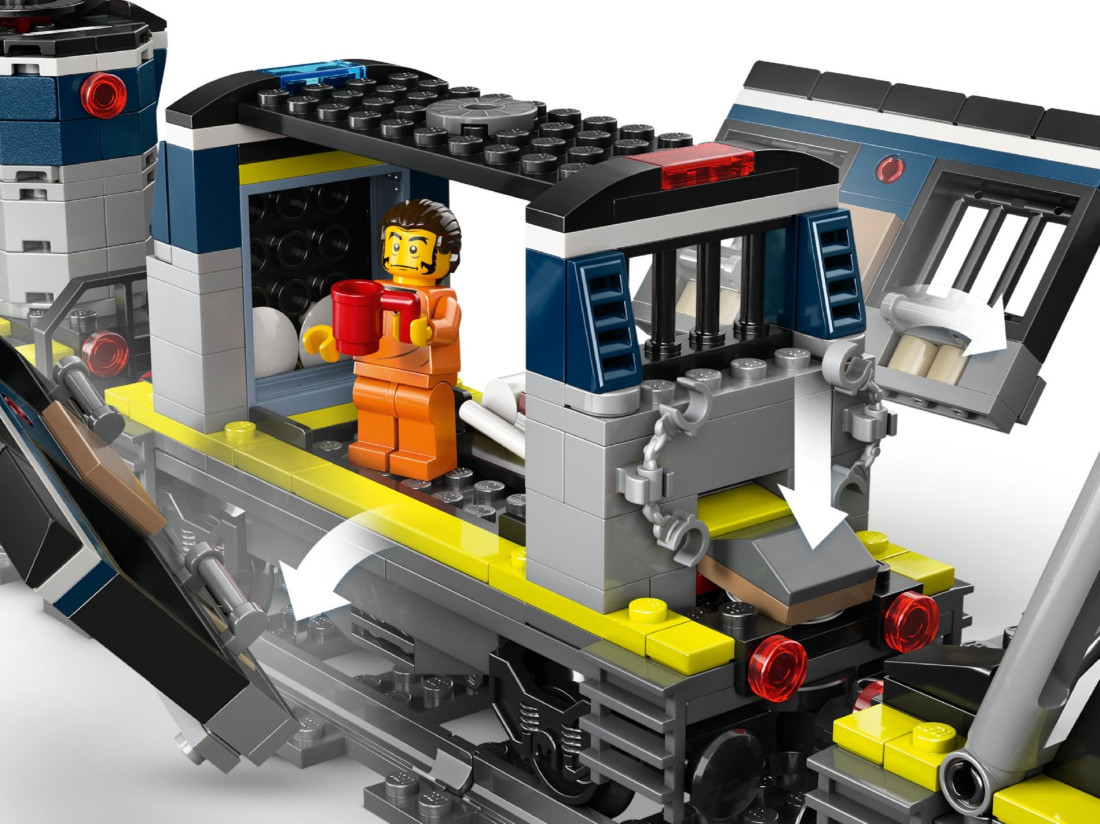 Поїзд тягне три платформи: з тюремною камерою, банківським сейфом і ралійним автомобілем. У комплект входить переїзд і елемент для легкого повернення коліс на рейки. У зловмисників — вертоліт із робочим захоплювачем, здатним забрати сейф, машину або камеру просто на ходу. У комплекті 1 313 деталей і шість мініфігурок (детектив, поліцейський, машиніст і троє злочинців); розміри поїзда з трьома платформами — приблизно 9×80×6 см.