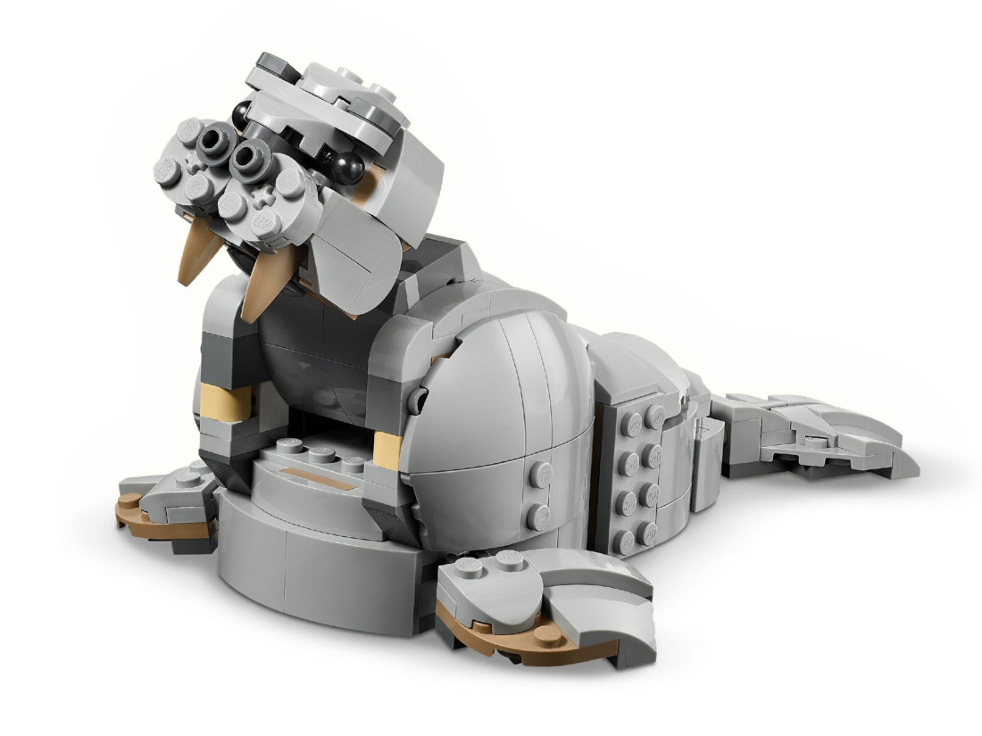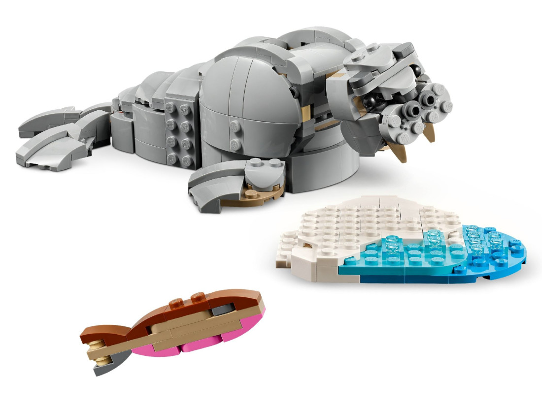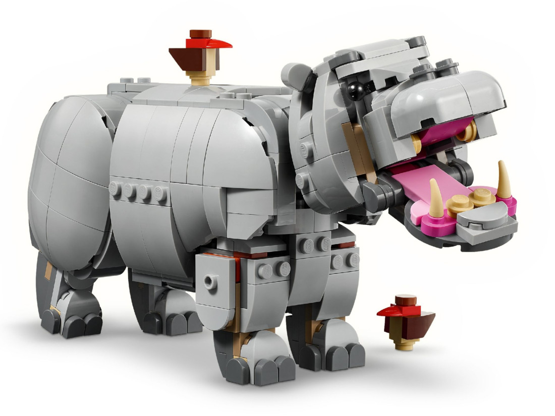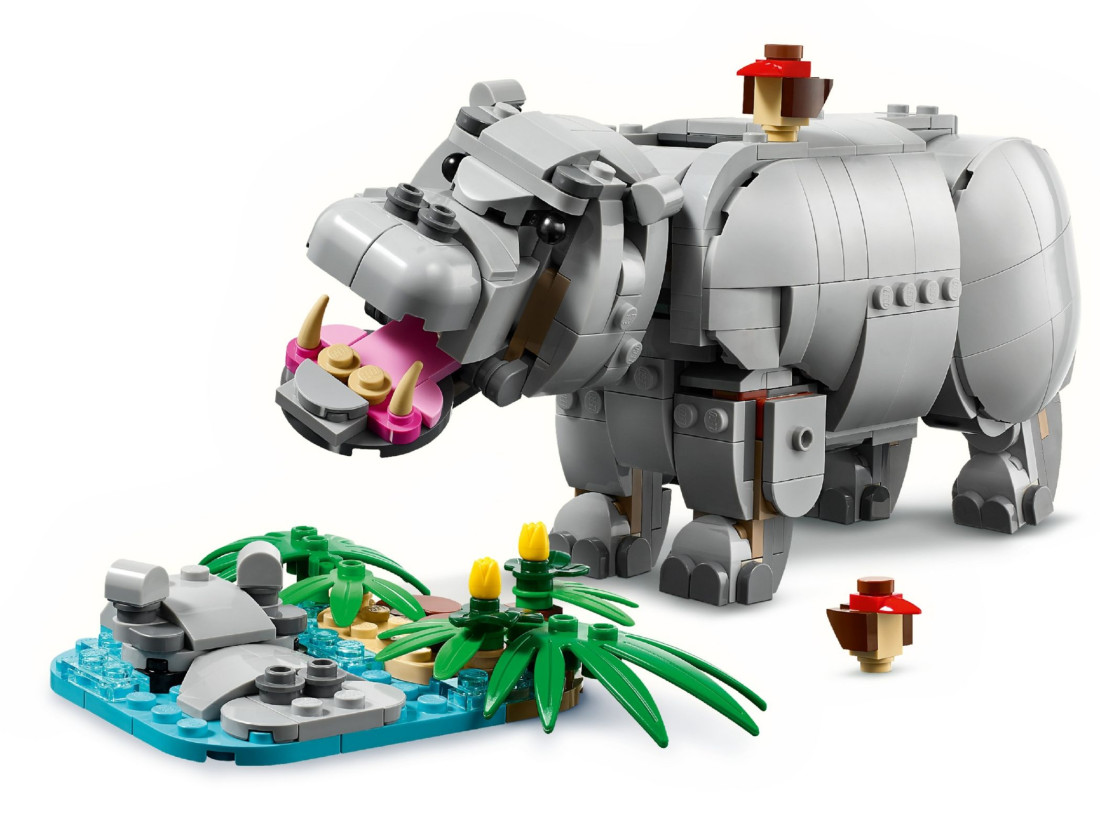 Сконструюйте носорога з равликом і чотирма птахами, перебудуйте в гіпопотама з двома птахами або в моржа з рибою — збірки виконуються окремо. У тварин рухливі ноги й ступні, шия й голова, вуха, рот і хвіст, тож їх легко ставити в природні пози. Для сцен передбачені невеликі елементи оточення: клаптик трави з водою для носорога й гіпопотама та крижина з водою для моржа. Підтримується застосунок LEGO Builder із наочними 3D-інструкціями.