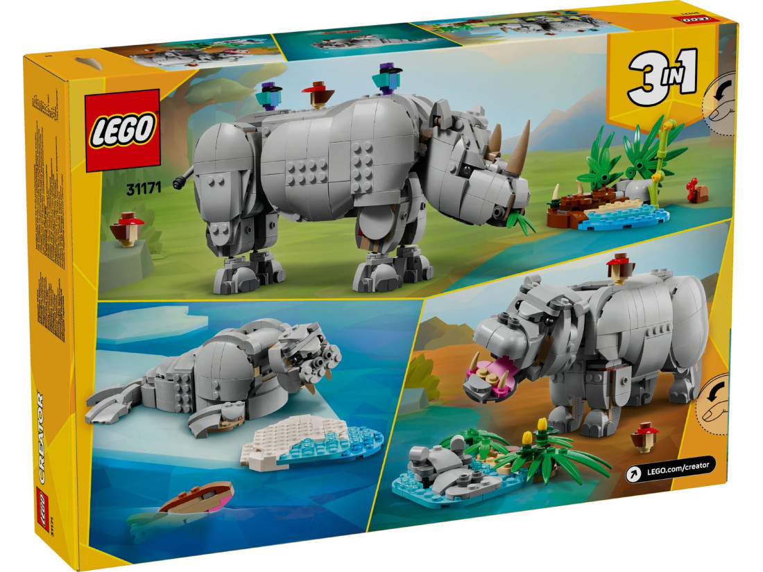 Познайомте дитину зі світом дикої природи з набором LEGO Creator 3in1 «Величний носоріг і птахи» (31171) для дітей від 9 років. У комплекті 780 елементів, з яких по черзі збираються виразні моделі та розігруються сюжети савани, боліт і північних морів.