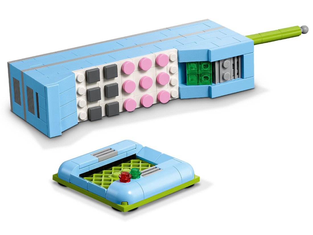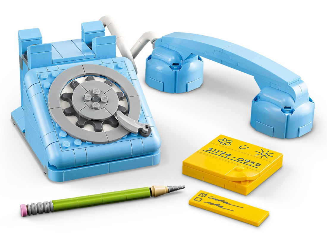 Механіка й аксесуари продумані до дрібниць: гнучкий шнур, обертовий диск набирання номера й ефект «опускання» слухавки створюють впізнавані жести, а збірні олівець і персоналізований блокнот із трьома варіантами написів допомагають оформити сценку. Основна модель — дисковий телефон — має розміри приблизно 7×15×11 см. Покрокові цифрові інструкції доступні в застосунку LEGO Builder із зручним 3D‑переглядом і відстеженням прогресу.