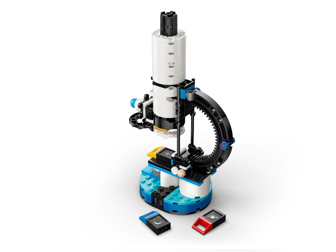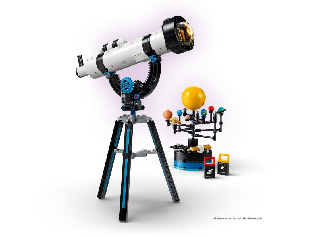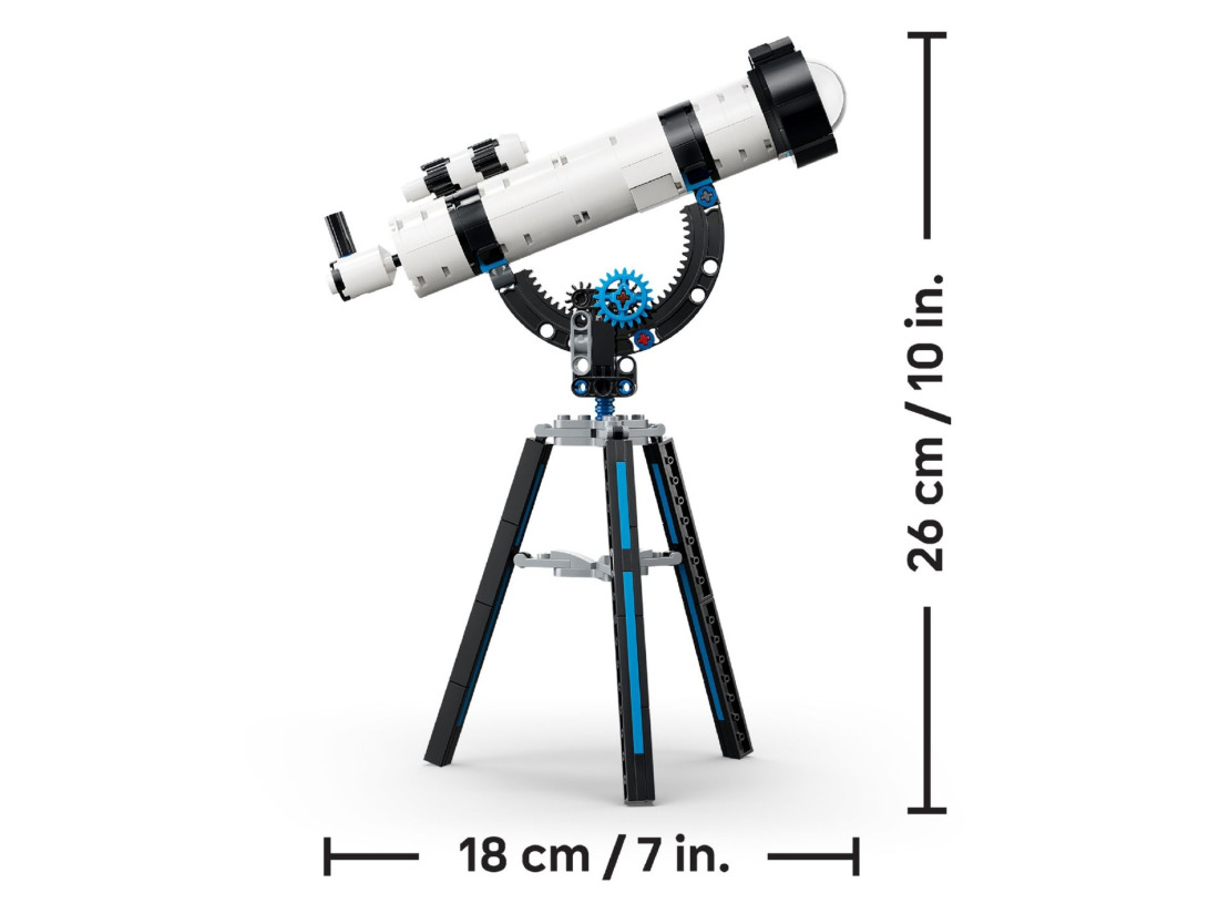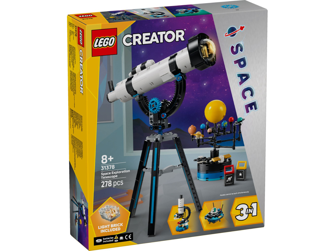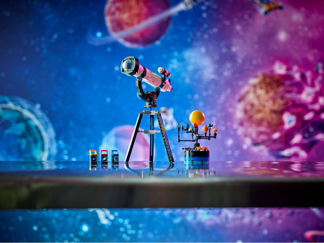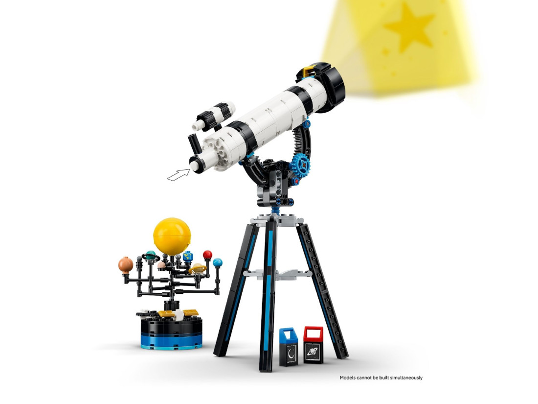 Набір LEGO CREATOR 3 в 1 «Астрономічний телескоп» (31378) знайомить дітей від 8 років зі світом науки та спостережень за космосом. З 278 елементів можна зібрати телескоп на тринозі з міні-моделлю Сонячної системи: навколо Сонця обертаються 7 планет. Світлова цеглинка проєктує зображення на поверхню, а три змінні лінзи з малюнками планети, зірки та Місяця розширюють сценарії гри.