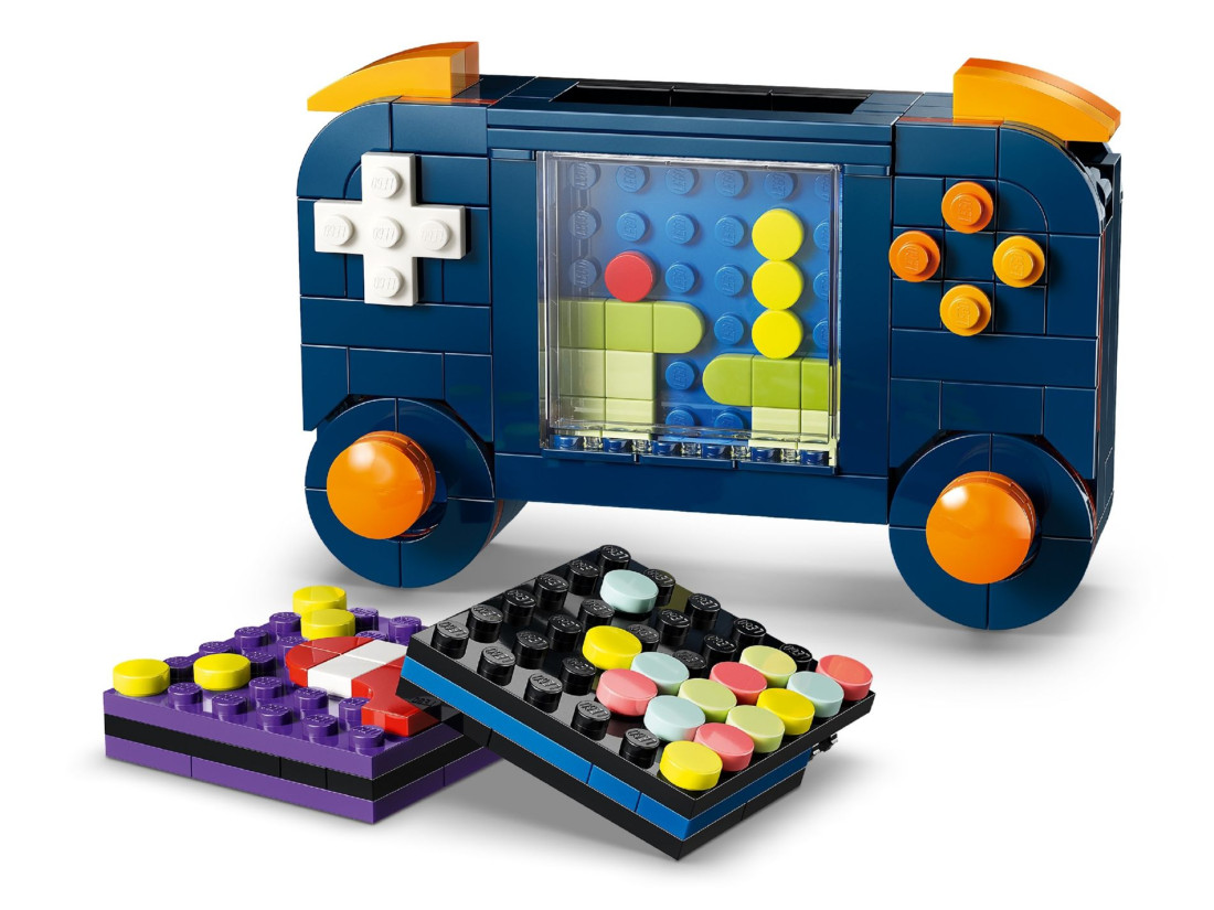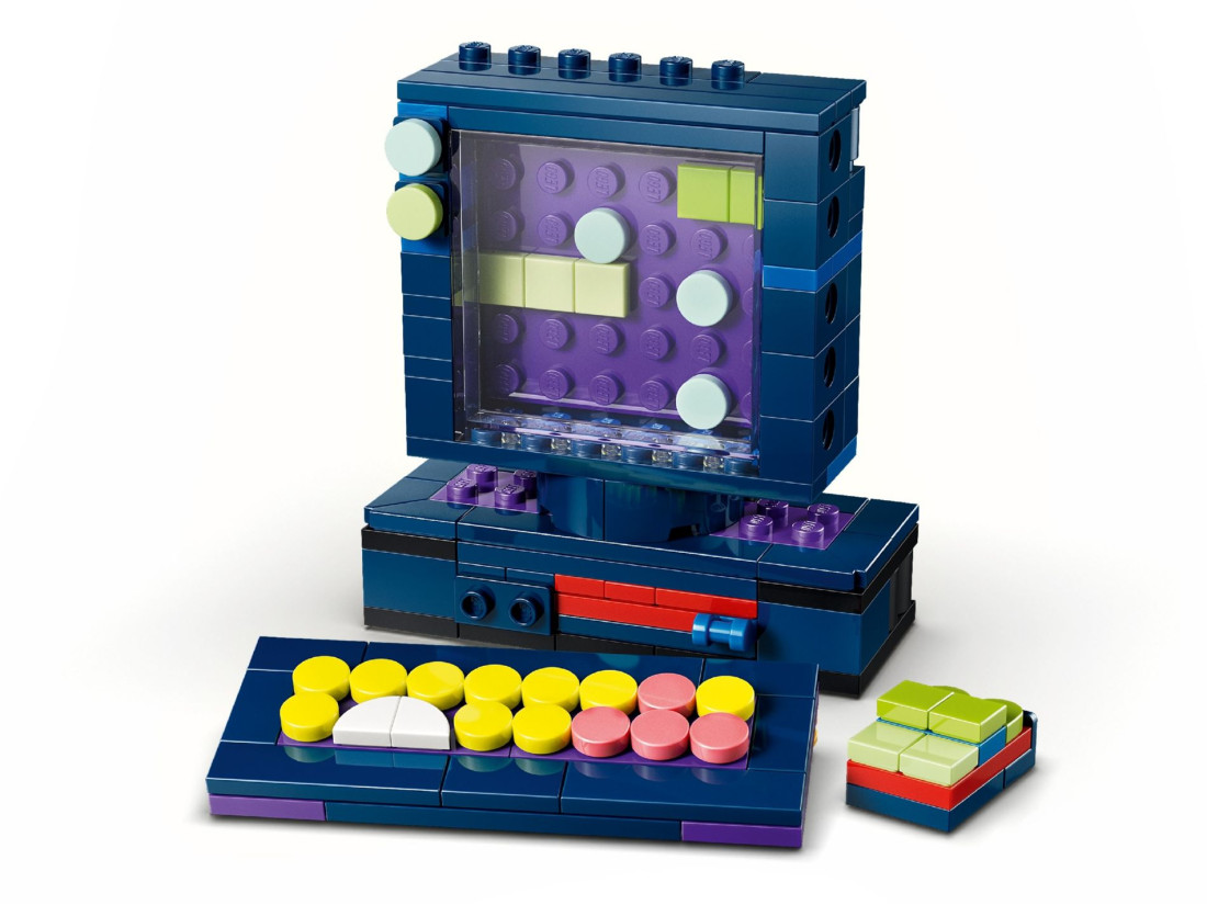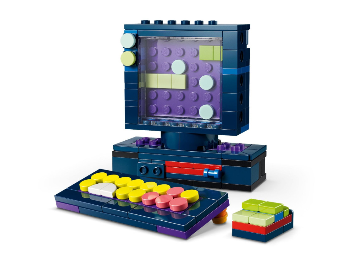 З елементів можна створити портативну консоль із двома рухомими джойстиками, кнопками та трьома змінними картриджами, потім перебудувати її в мінікомп’ютер із монітором, клавіатурою, «диском» і мишею або зібрати аркадний автомат із характерними контурами. Після складання кожна версія слугує тематичним декором, а компактні розміри зручні для розміщення. У наборі 268 деталей; габарити портативної консолі: приблизно 8 × 12 × 4 см (висота × ширина × довжина).