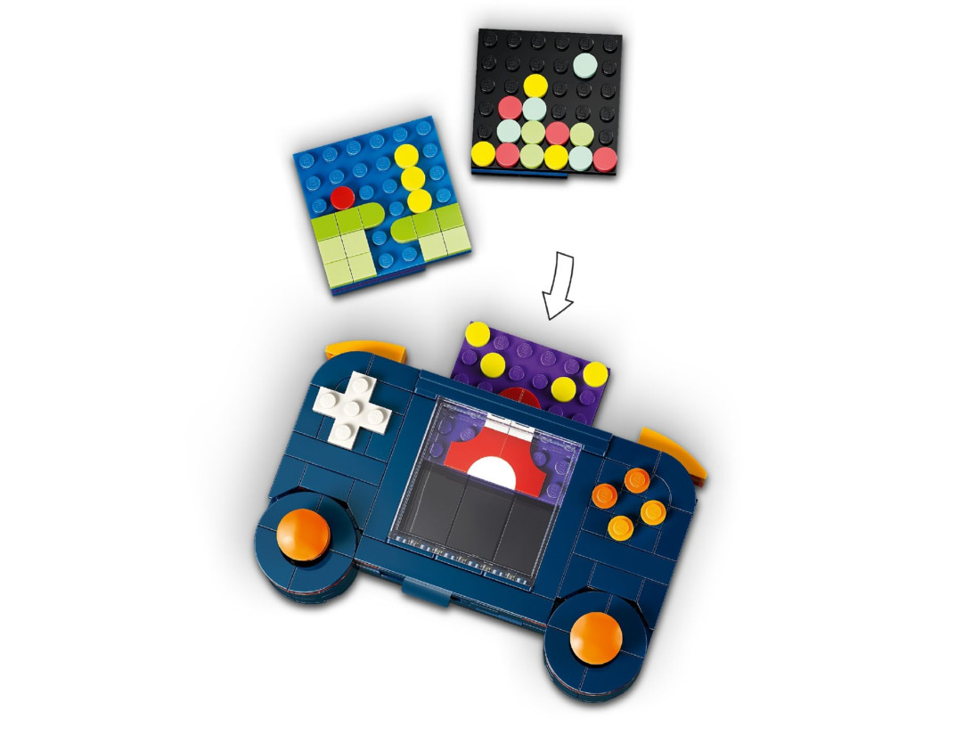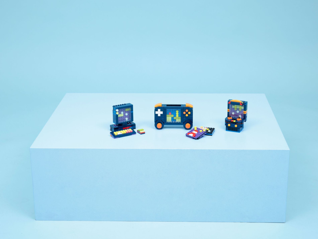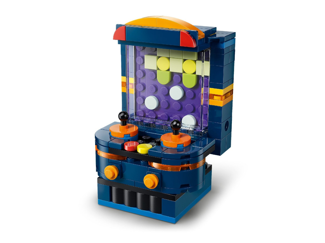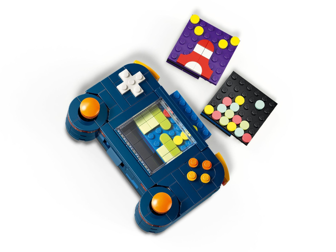 З елементів можна створити портативну консоль із двома рухомими джойстиками, кнопками та трьома змінними картриджами, потім перебудувати її в мінікомп’ютер із монітором, клавіатурою, «диском» і мишею або зібрати аркадний автомат із характерними контурами. Після складання кожна версія слугує тематичним декором, а компактні розміри зручні для розміщення. У наборі 268 деталей; габарити портативної консолі: приблизно 8 × 12 × 4 см (висота × ширина × довжина).