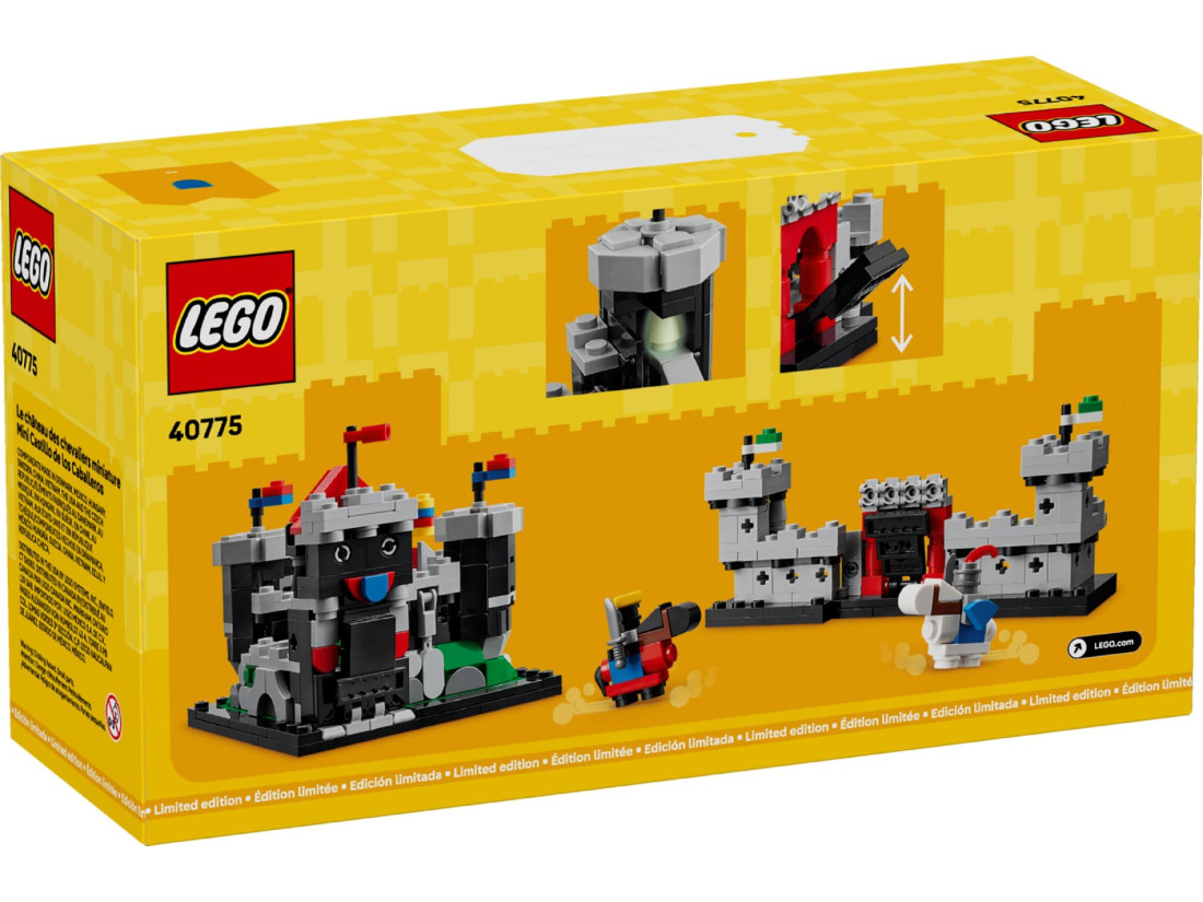 LEGO CREATOR Міні-лицарський замок (40775) — набір для поціновувачів класичних фортець і середньовічного антуражу. Модель у мікромасштабі відсилає до легендарних випусків серії LEGO CASTLE — 6073 (1984) і Black Knight’s Castle 6086 (1992), зберігаючи впізнавані риси епохи: кам’яні стіни, вежі, прапорці та підйомні ворота. Велика фортеця та компактний міні-замок утворюють цілісну композицію, що передає атмосферу культових наборів 80–90-х.