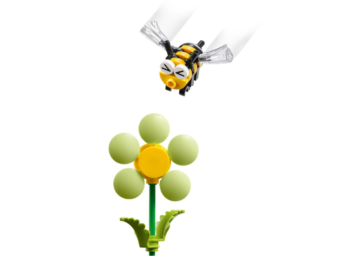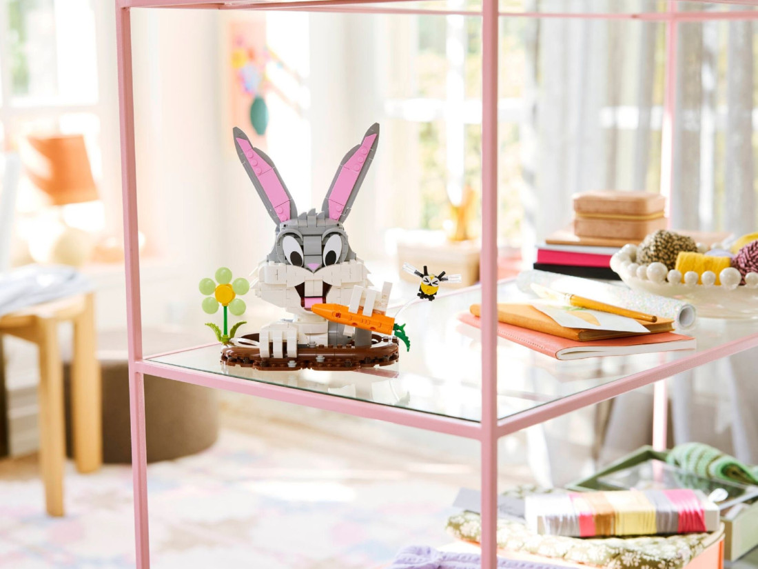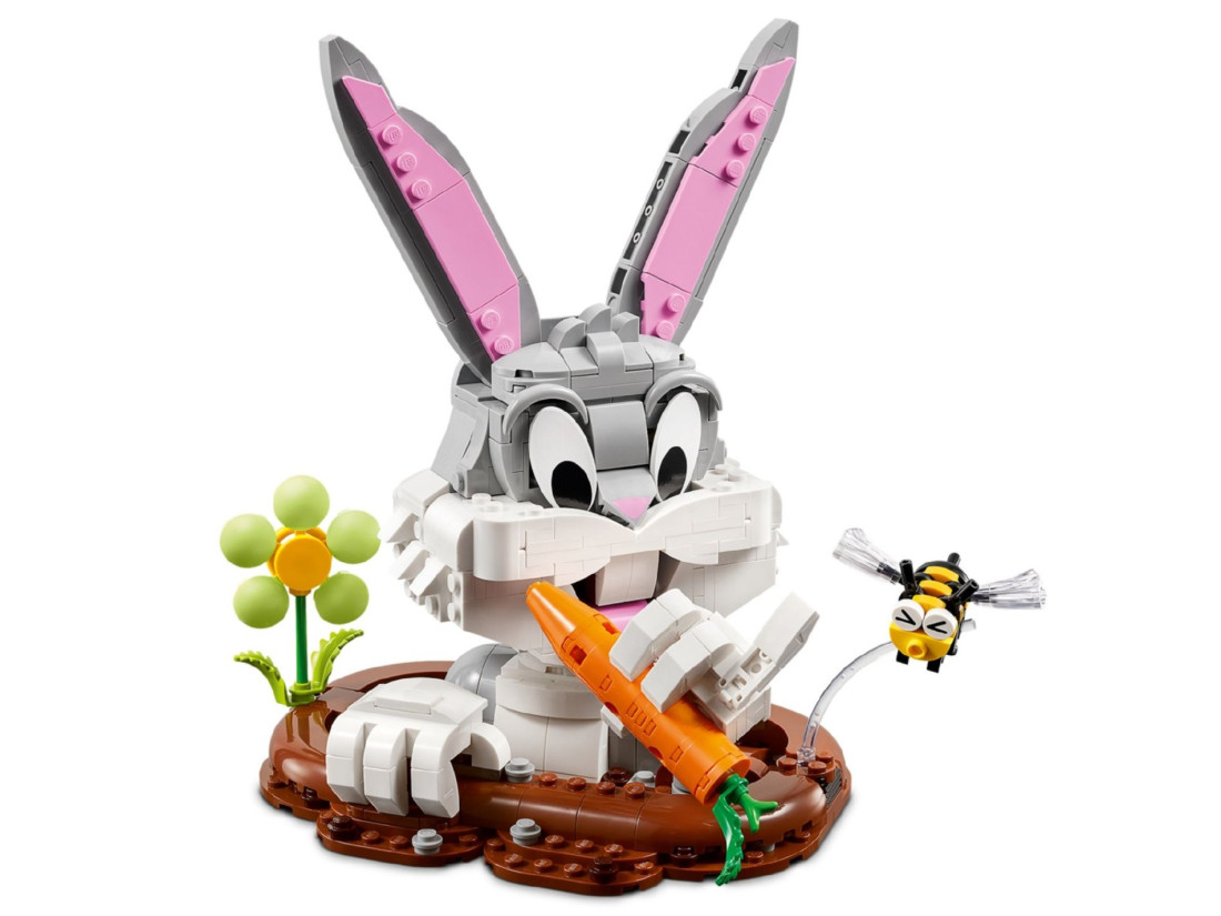 LEGO Looney Tunes Bugs Bunny (40920) — колекційний набір для створення деталізованого бюста легендарного героя анімації. Скульптура збирається на охайній підставці, що імітує край нори, тож здається, ніби кролик виглядає назовні. Вуха, голову, руки та пальці можна повертати й нахиляти, змінюючи міміку та жести — від іронічного вітання до пустотливої пози. У лапах — незмінна морква, впізнавана деталь образу. Композицію доповнюють невеликі сезонні акценти: бджілка з виразною мордочкою та декоративна весняна квітка.