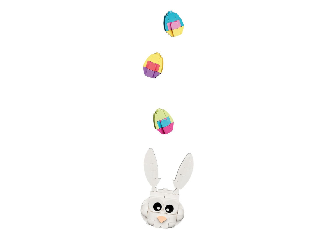 У центрі композиції — великодній кролик із рухомими вушками, довкола — жовтий бант, листя, квіти та різнокольорові яйця. Модель складається з 747 деталей і після складання сягає приблизно 31 см у діаметрі. Вінок можна підвісити на двері або стіну за допомогою вбудованого кріплення або розмістити на столі як святковий акцент. Елементи декору легко переставляти, створюючи щоразу нові варіанти.