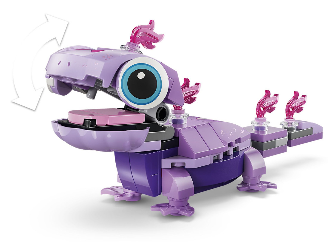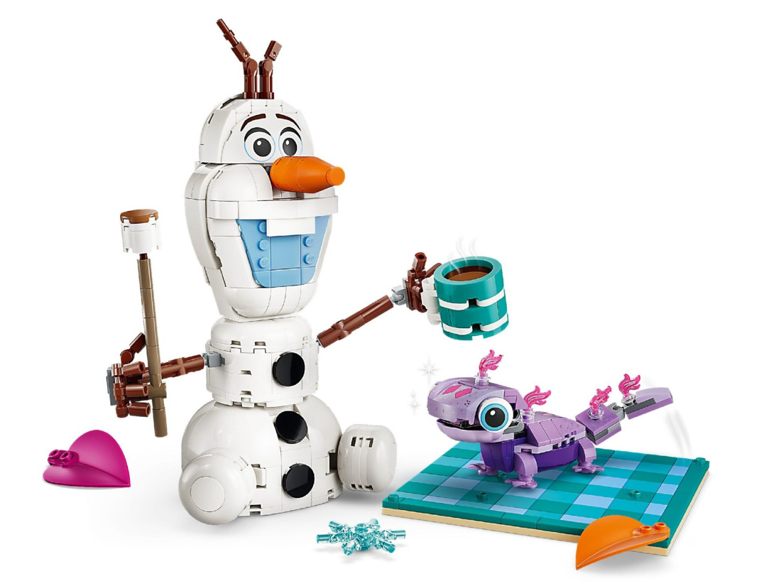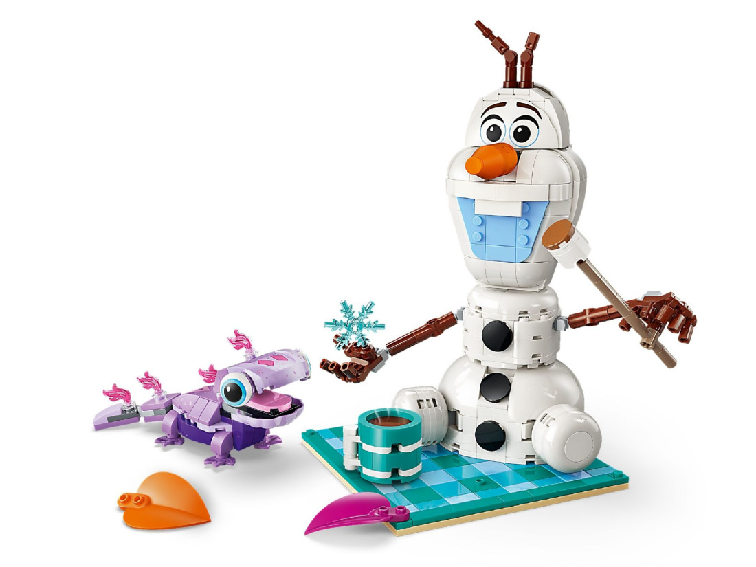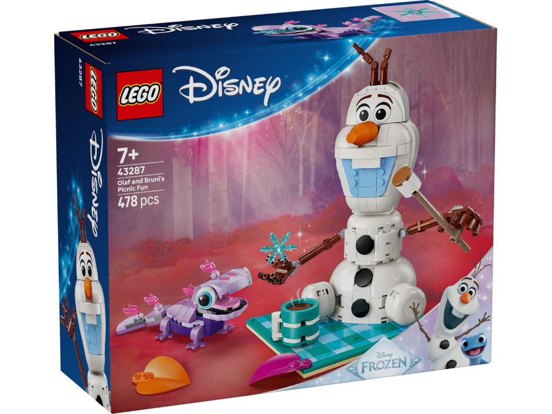 У комплекті є дві збірні фігурки: Олаф із рухомими руками, здатними утримувати предмети, і саламандра Бруні з рухомим хвостом, декоративними вогниками та пащею, що відкривається. Пікнікову тематику підтримують аксесуари — горнятко гарячого шоколаду, сніжинка, листя для декору пледа та паличка з маршмелоу. Інструкції доступні в зручному застосунку LEGO Builder. Кількість деталей — 478. Приблизні розміри сцени з Олафом: висота 23 см, ширина 20 см, глибина 15 см.