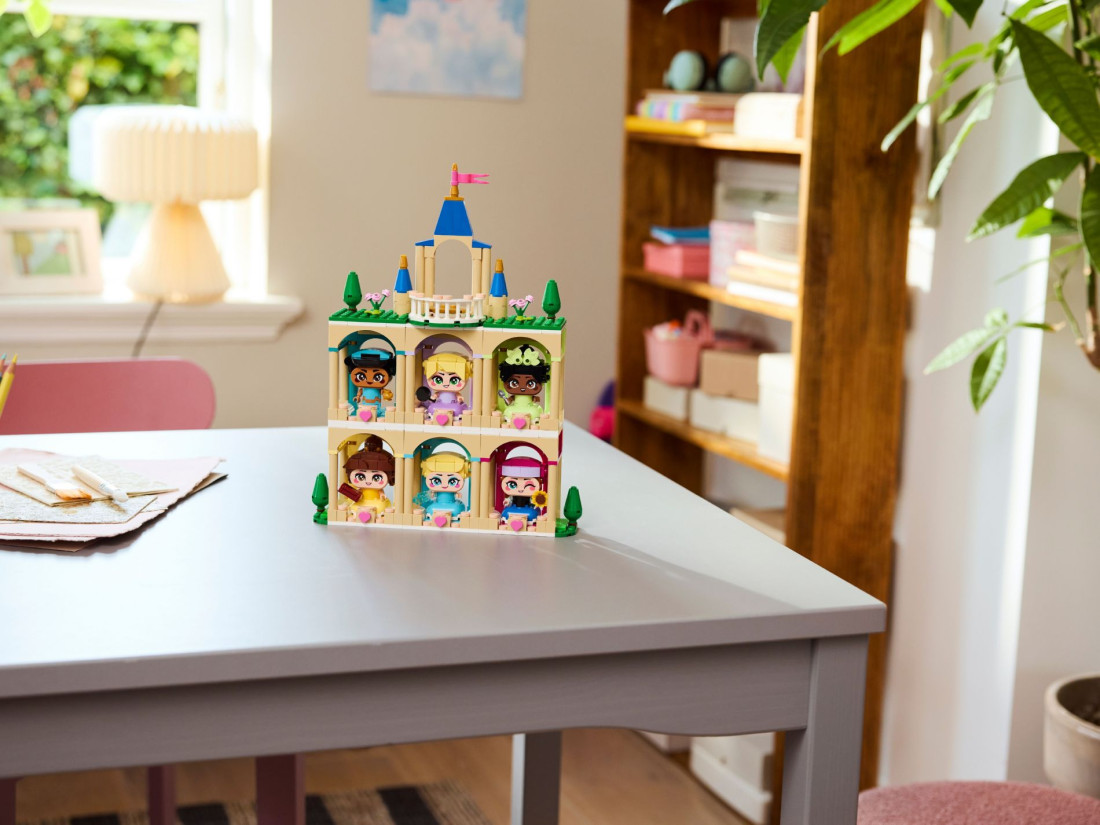 Набір LEGO Disney Princess «Міні‑принцеси: Белль і Тіана у замку» (43291) призначений для дітей від 5 років і переносить гру у світ класичних історій. Трирівневий замок виконаний у впізнаваній кольоровій палітрі та включає тематичні простори для різних занять, а в центральній вежі розміщена обертова платформа, на яку можна поставити будь-яку фігурку із серії. У комплект входять збірні мініфігурки Белль і Тіани з рухомими руками та аксесуарами: книга для читання і ложка для кулінарних експериментів.