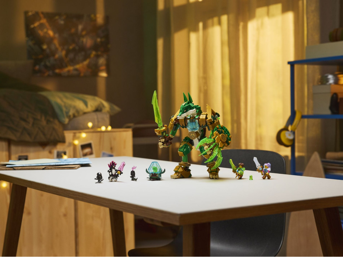 До набору входять мініфігурки Матео, Іззі та Імператора Кошмарів; їхнє спорядження виконане в характерних кольорах героїв. Сюжет підтримують фігурка Z-Blob, дві істоти Grimspawn і «алмазне» яйце, з якого з’являється зелене скарбове створіння. У комплекті 883 деталі; у формі меха-воїна модель сягає приблизно 26 см у висоту, 25 см у ширину й 20 см у глибину, що робить її зручною як для рольової гри, так і для розміщення на полиці.