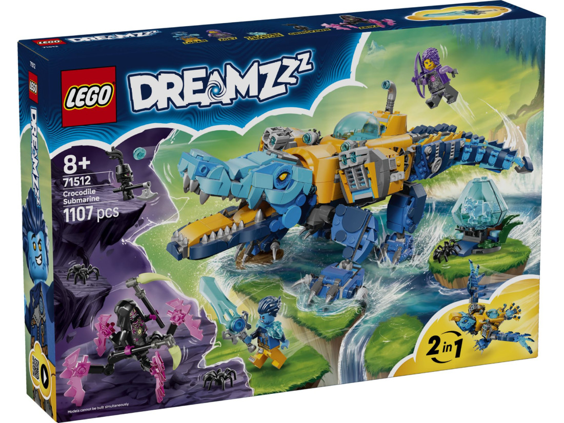Набір LEGO DREAMZzz «Підводний човен-крокодил» (71512) призначений для дітей від 8 років і поєднує підводні та повітряні сцени зі світу снів. З одного комплекту деталей можна зібрати на вибір два образи: субмарину-крокодила з рухомою головою, лапами й хвостом або човен-орла з розкривними крилами та висувними перами-прискорювачами. Обидва варіанти оснащені подвійними прискорювачами, стріляючими елементами й прихованими відсіками; у кабіні передбачене місце для мініфігурки-пілота.