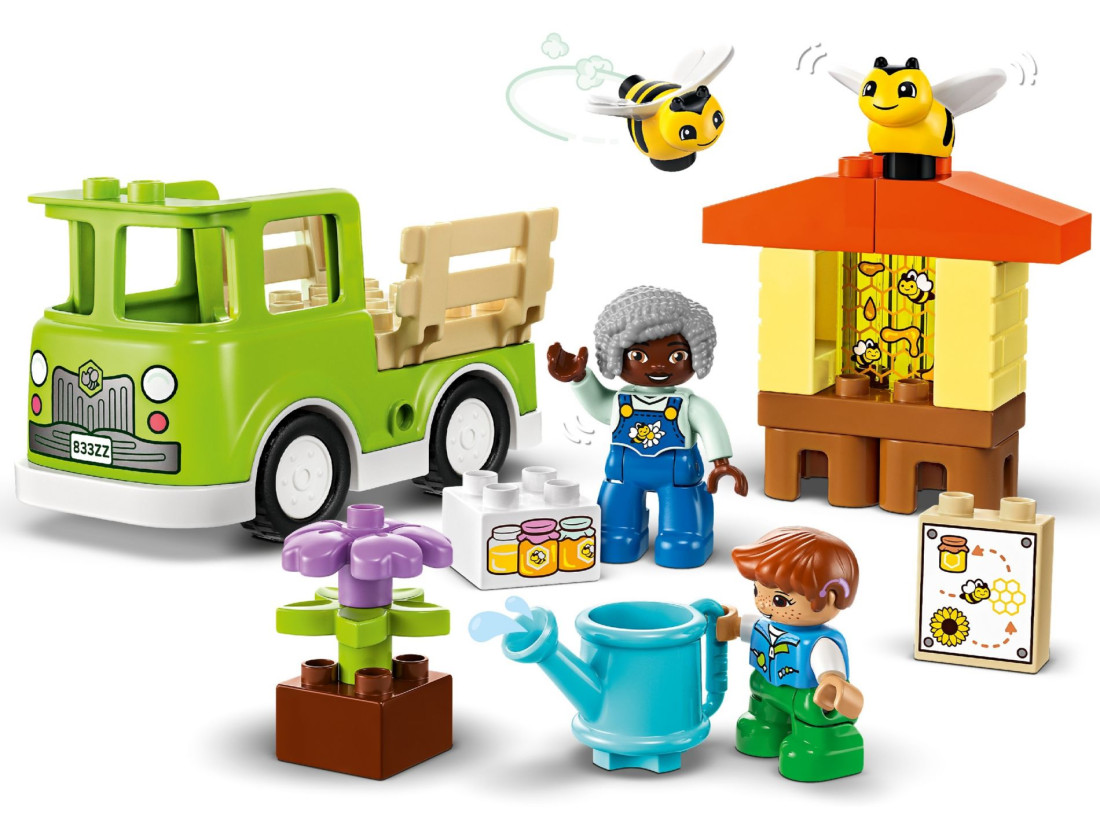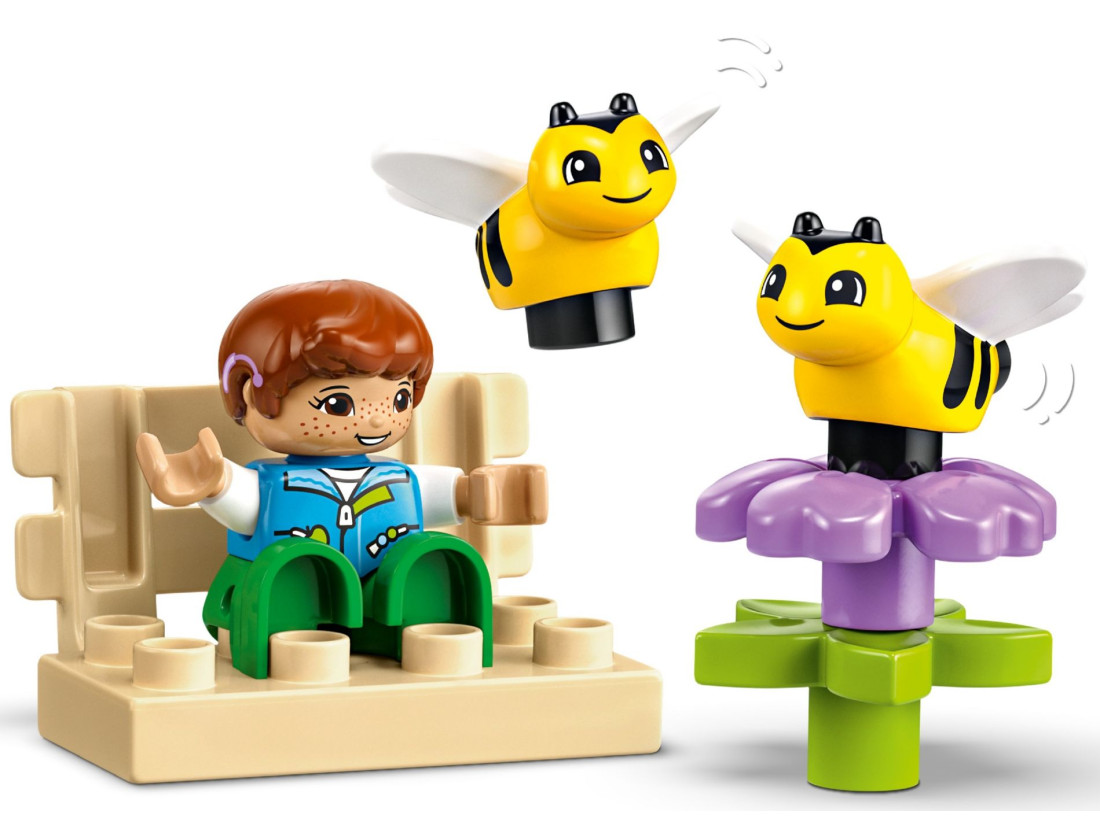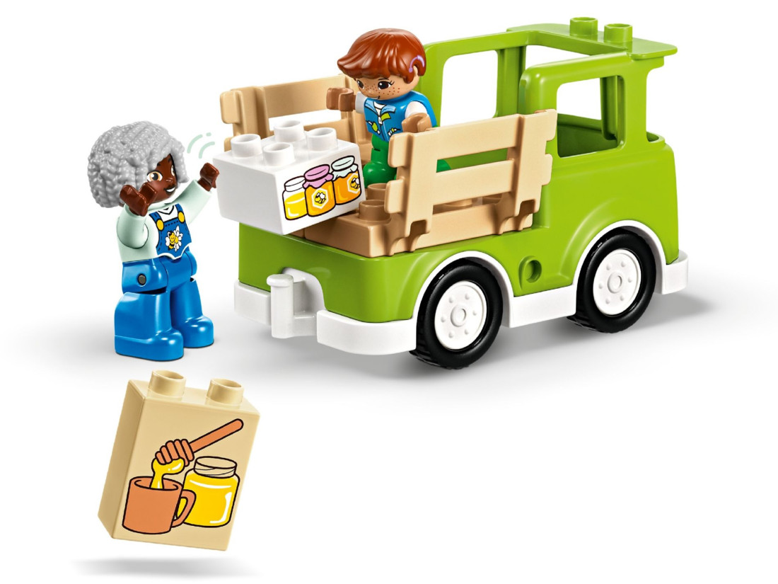 У наборі також є 2 фігурки LEGO DUPLO - бабуся та дитина, які можуть збирати мед, завантажувати його у вантажівку та везти на ринок. Малята розвиватимуть свої дрібні моторні навички, перетворюючи вантажну платформу вантажівки на стіл з лавками, де персонажі можуть влаштувати чаювання з медом.