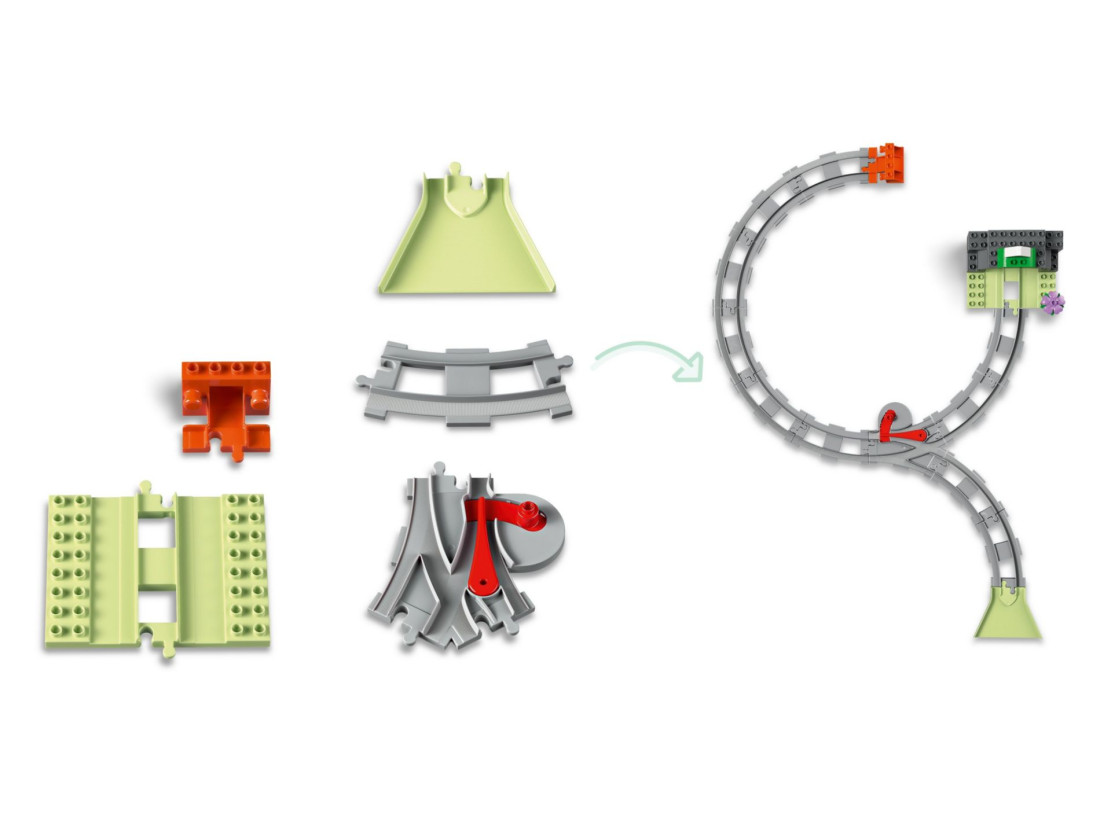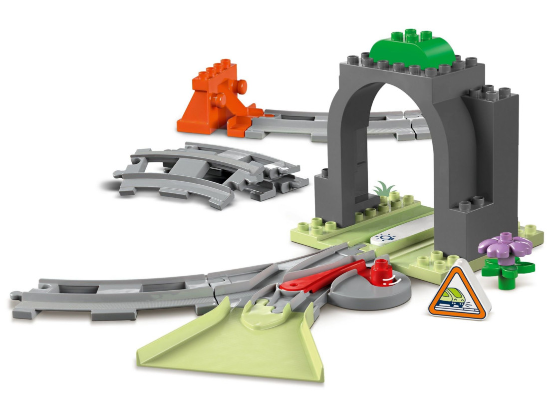 Цей креативний набір з 20 деталей включає тунель заввишки 20 см, шириною 16 см і глибиною 15 см, а також 10 елементів треку з унікальними функціями, такими як воронка та двостороння стрілка, що дозволяє малюкам змінювати напрямок руху поїзда. У набір входить активна цегла, яка загоряється в тунелі, створюючи інтерактивний та візуально захоплюючий досвід у поєднанні з наборами 10427 та 10428.