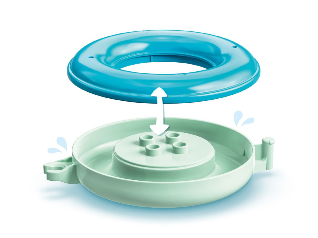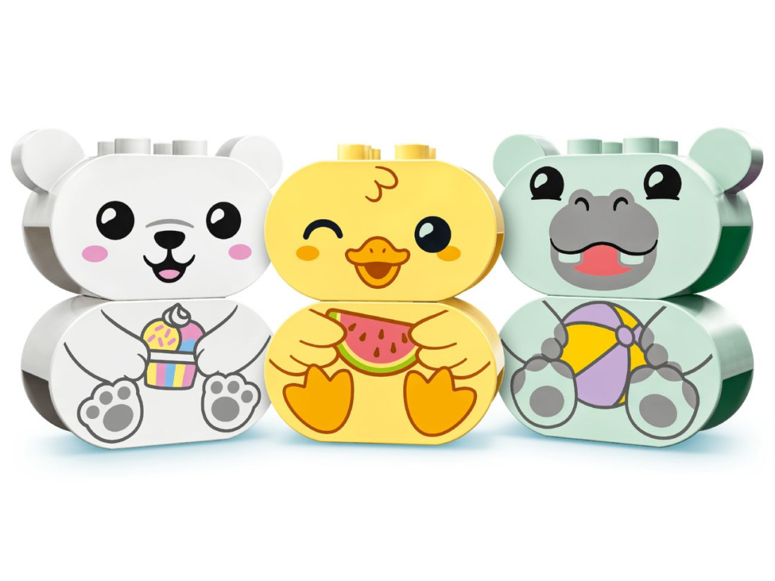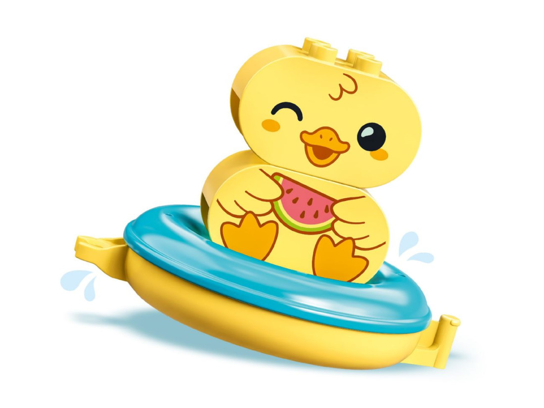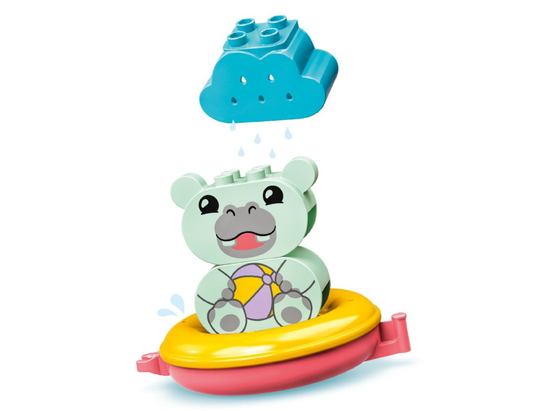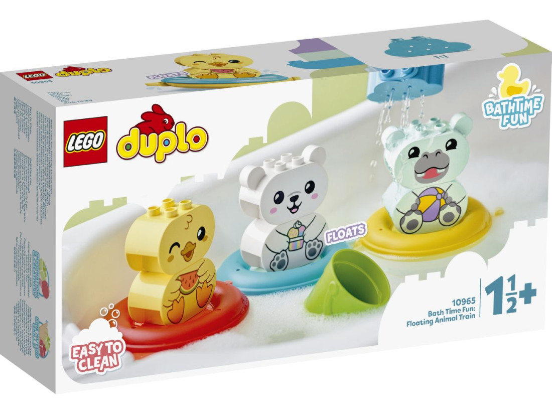 Ігровий набір LEGO DUPLO Плавучий поїзд для тварин (10965) робить час у ванні захопливим і розвивальним. До комплекту входять три збірні тваринки — бегемот, каченя та білий ведмежа, відерце й хмаринка-лійка, а також три великі плавучі кільця. Кільця з’єднуються в «поїзд», легко роз’єднуються та стійко тримаються на воді; елементи відкриваються для швидкого промивання після ігор. Набір рекомендований дітям від 18 місяців.