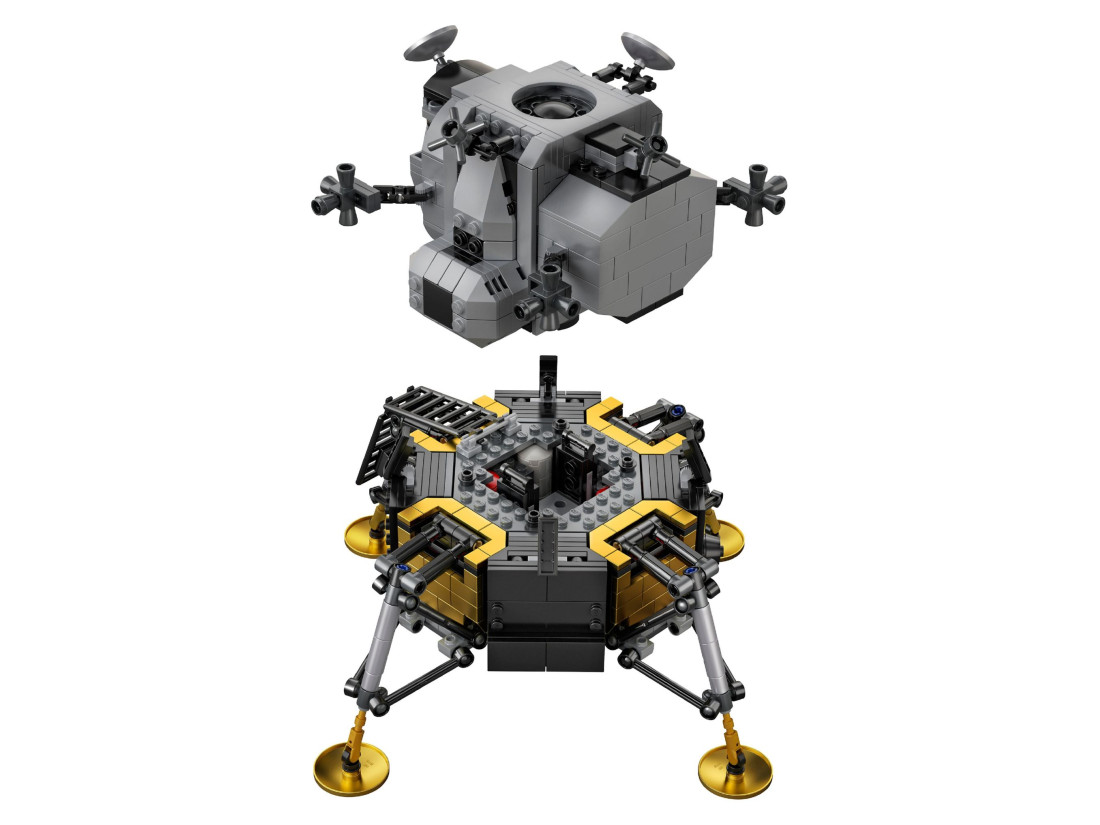 До комплекту входять 2 мініфігурки астронавтів із символікою NASA та золотистими шоломами, а також аксесуари для інсценування наукових експериментів. Спускний ступінь вирізняється золотистими опорами, посадковими майданчиками та відсіками, трапом і апаратурою спостереження; підйомний ступінь має пропрацьований інтер’єр, розрахований на двох пілотів. Основа з кратером, відбитками слідів і прапором США доповнює експозицію; передбачена табличка з назвою місії. Модель складається з 1087 деталей, рекомендована для будівників 16+ і у зібраному вигляді досягає приблизно 20×22×20 см.