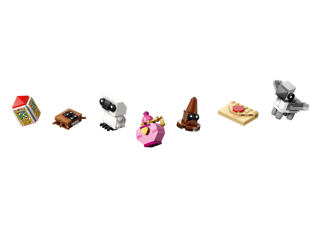 Усередині — 8 мініфігурок у зимових светрах (Гаррі Поттер, Драко Мелфой, Луна Лавґуд та ін.), 6 збірних істот — Гедвіґа, Клювокрил, Араґоґ, Фестрал, Мандраґора та Патронус‑олень з рухомими елементами. Тематику підтримують 9 міні‑моделей, серед яких лист про зарахування, шоколадна жаба, желейні боби Берті Ботта, вершкове пиво, Розподільний Капелюх, зілля та «Книжка‑монстр про монстрів». Ілюстровані інструкції надруковані на зворотному боці дверцят; 3D‑збірка доступна в застосунку LEGO Builder.