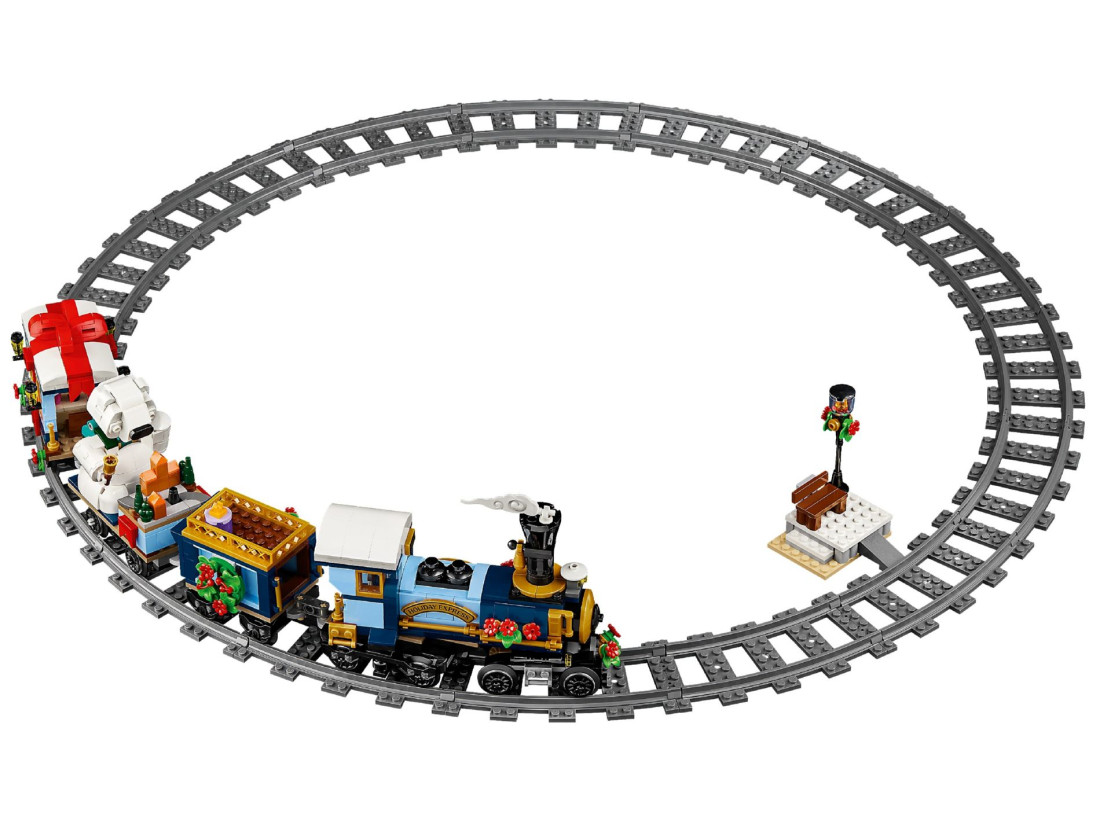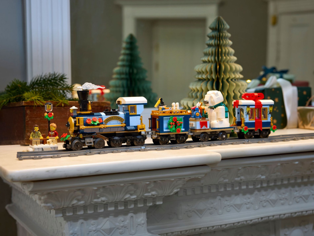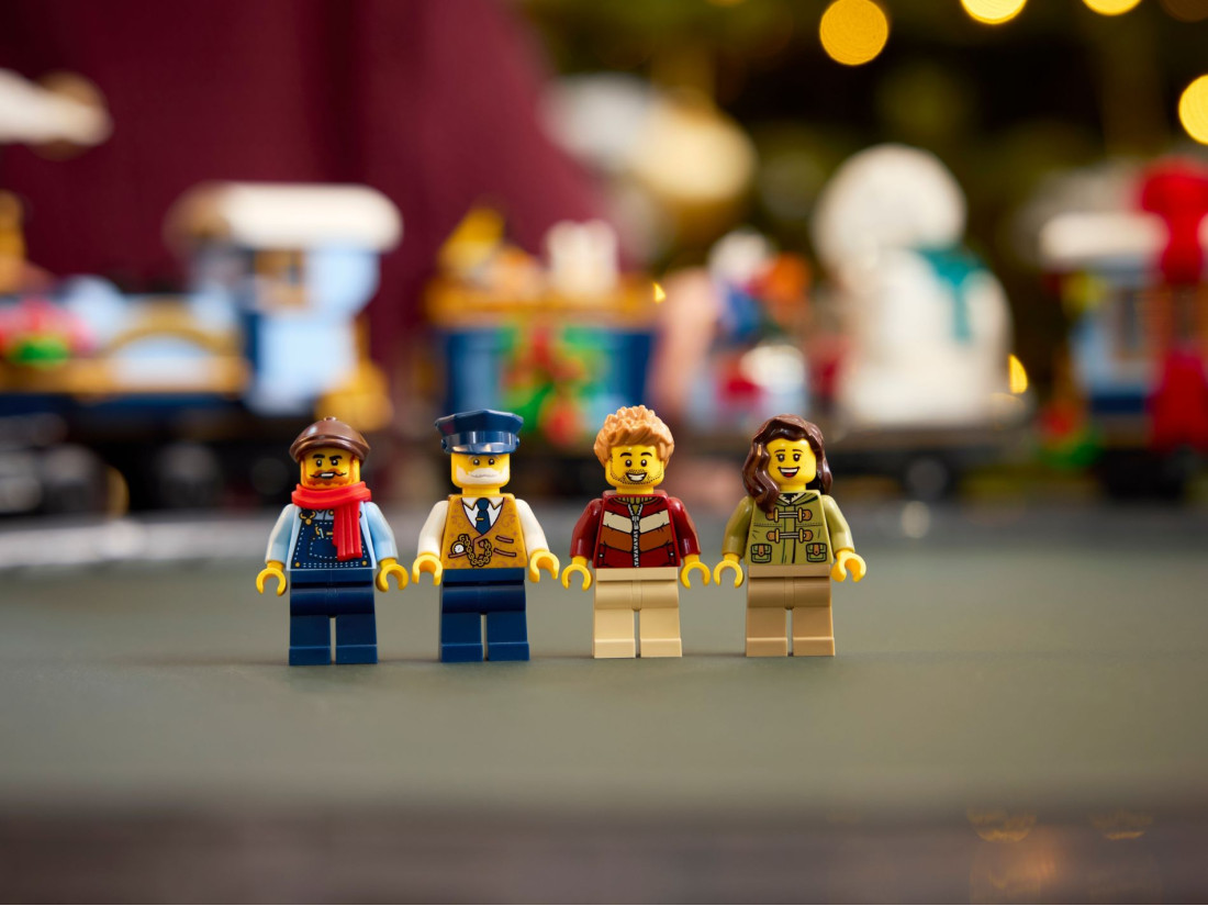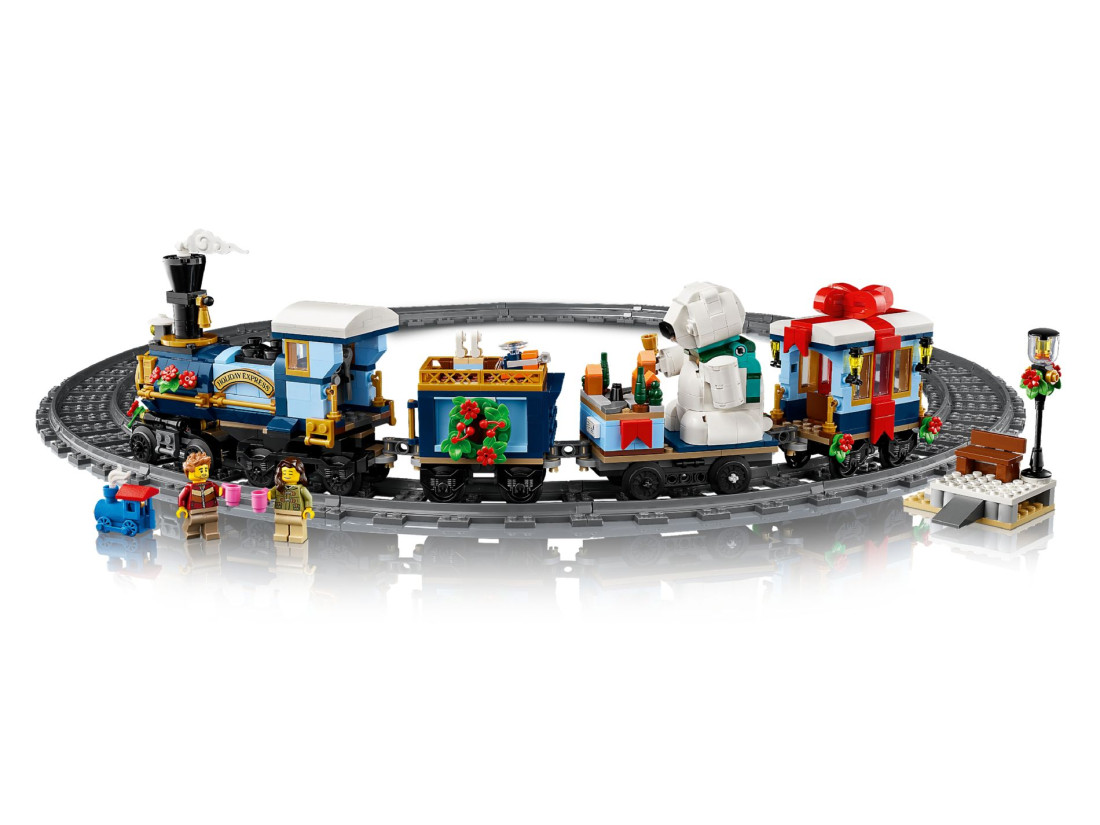 LEGO ICONS «Святковий експрес» (10361) — детальний набір для дорослих 18+ з 956 елементів. До складу входять класичний локомотив із вугільним тендером, пасажирський вагон і хвостовий вагон з облаштованим інтер’єром, а також невелика платформа з лавкою та ліхтарним стовпом. Кільцева колія зібрана з 16 вигнутих рейок, у комплекті 4 мініфігурки для розігрування зимових сцен. Модель створює атмосферний центр новорічної композиції та водночас пропонує безліч ігрових сценаріїв.