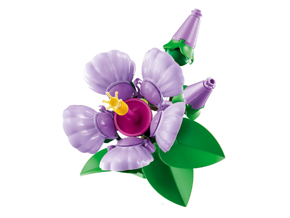 У композиції передбачено п’ять розквітлих квіток, чотири бутони на стадії розкриття і дві молоді бруньки. Пелюстки й листя кріпляться на шарнірних елементах, що дозволяє змінювати ракурс і збирати різні варіанти оформлення. Темно-синій горщик підкреслює відтінки пелюсток і забезпечує стійке встановлення. Конструкція включає 660 деталей; підсумкові габарити — близько 36 см у висоту, 25 см у ширину і 13 см у глибину. Для зручності доступна цифрова інструкція в застосунку LEGO Builder з можливістю обертати 3D-модель і відстежувати прогрес. Рекомендований вік — 18+.