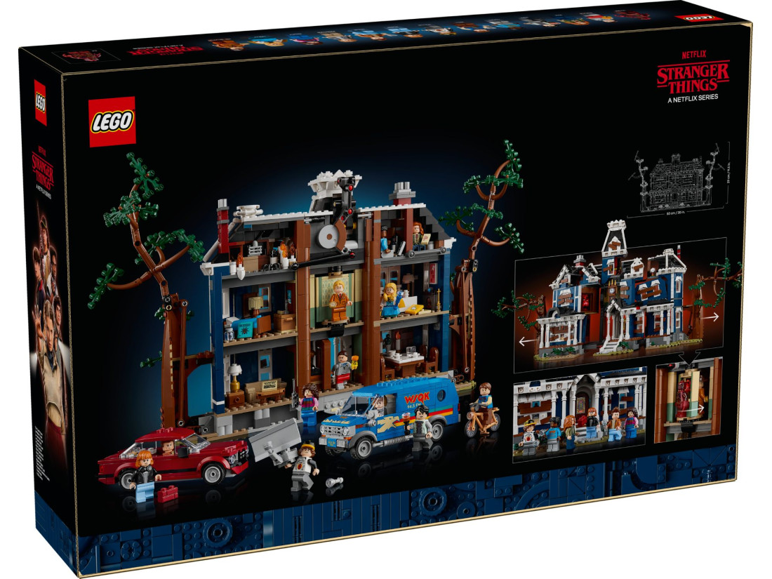 Ключова функція — трансформація: дім можна оформити «забитим дошками» або без них, а під час розведення кутів відкривається потойбічне лігво Векни Mind Lair із впізнаваним підлоговим годинником. У комплект входять атрибути й транспорт героїв — автомобіль Стіва, радіо‑фургон WSQK і велосипед Вілла — а також 13 мініфігурок: Вілл, Майк, Лукас, Дастін, Векна, містер Уотсіт, Голлі, Стів, Ненсі, Робін, Джонатан, Макс і Одинадцять.