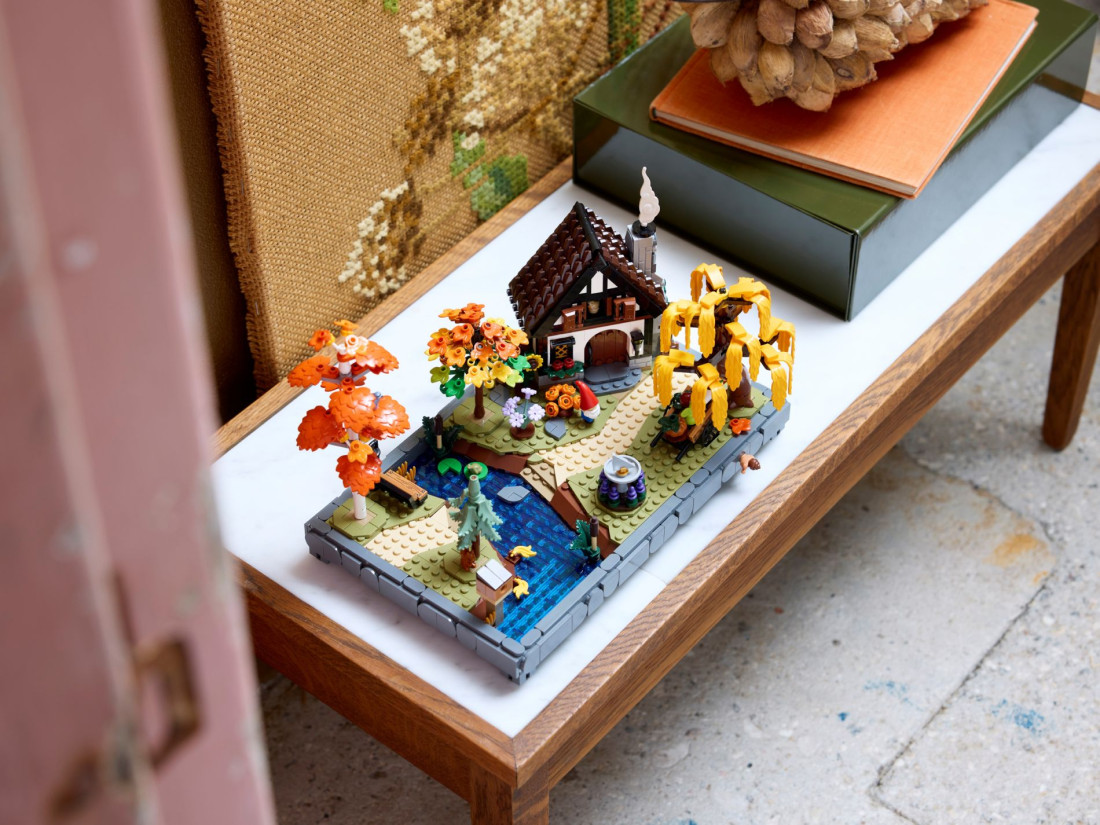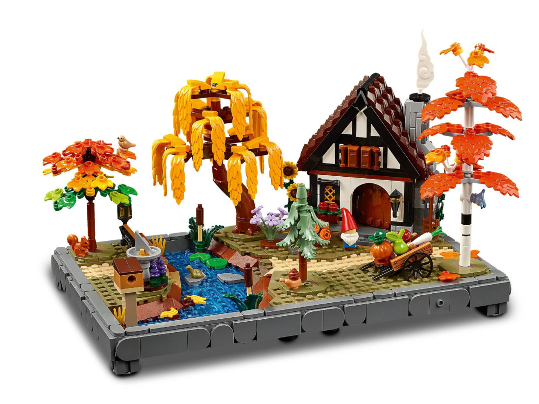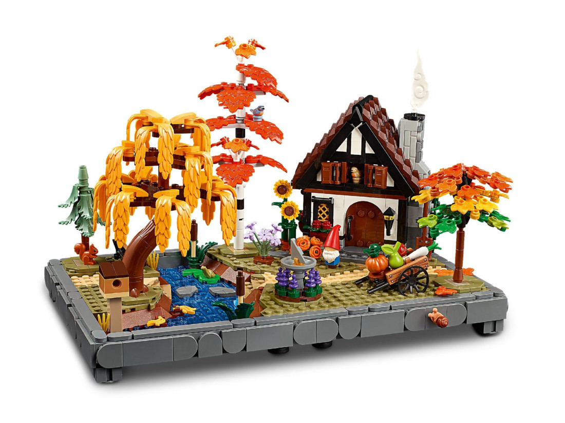 Модель містить будиночок із конструкцією, що відкривається, і затишною кухнею. Ділянку оформлено чотирма деревами — березою, плакучою вербою, блакитною ялиною та кленом — і доповнено сезонними насадженнями. Серед аксесуарів є сонячний годинник, будиночок для птахів, візок з овочами та садовий гном; між ступальними каменями тече струмок. Зустрічаються мініатюрні мешканці: малинівка, повзик, білка, жаба та равлик. 3D-інструкція доступна в додатку LEGO BUILDER; належить до колекції Gardens of the World. Габарити: 19 × 29 × 18 см; 1102 елементи; для дорослих.