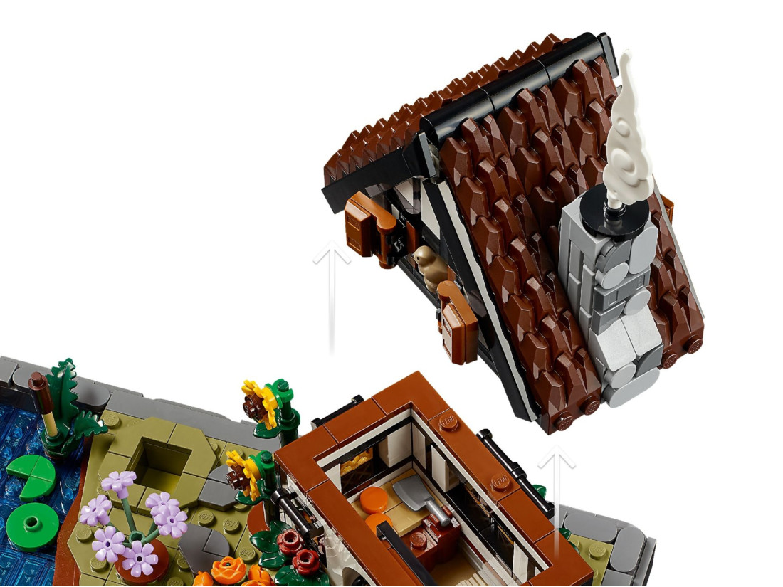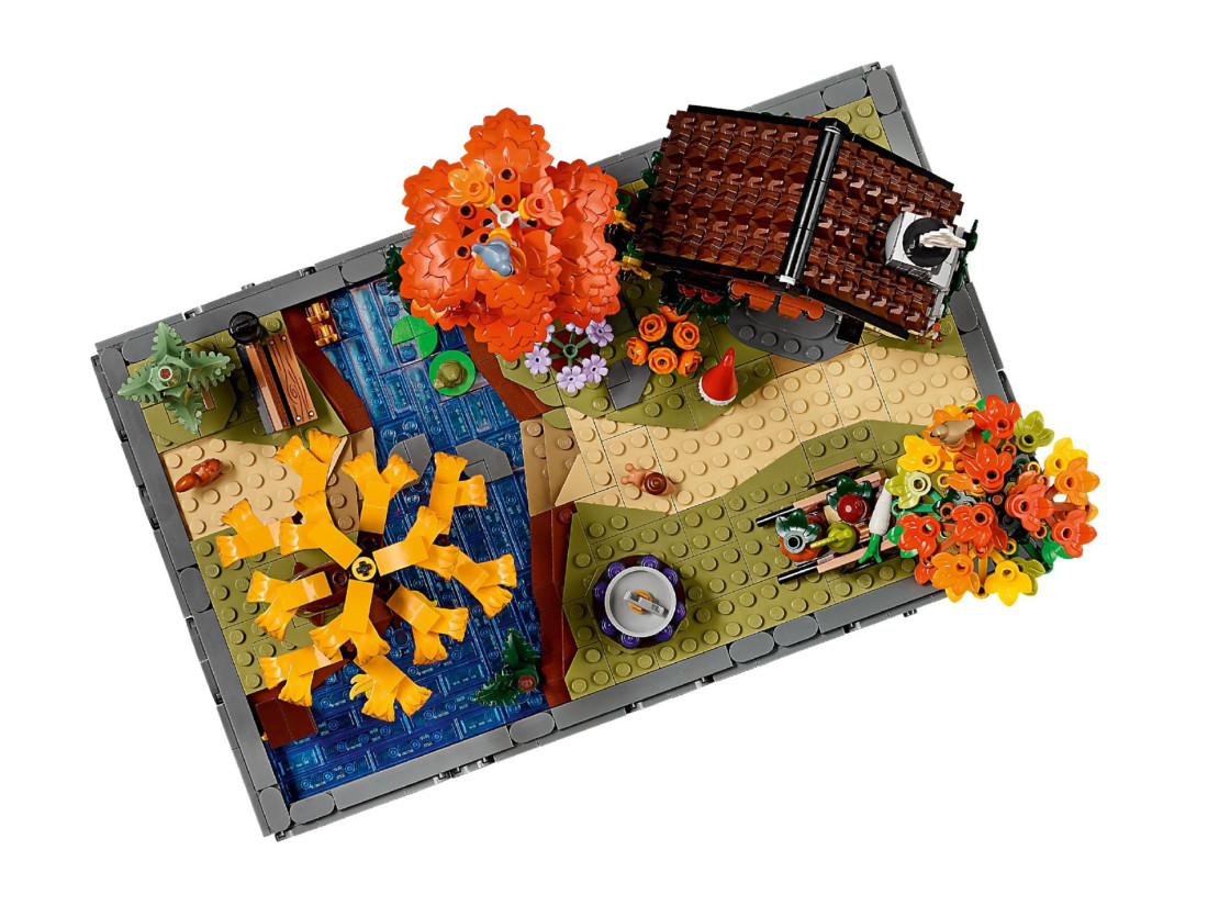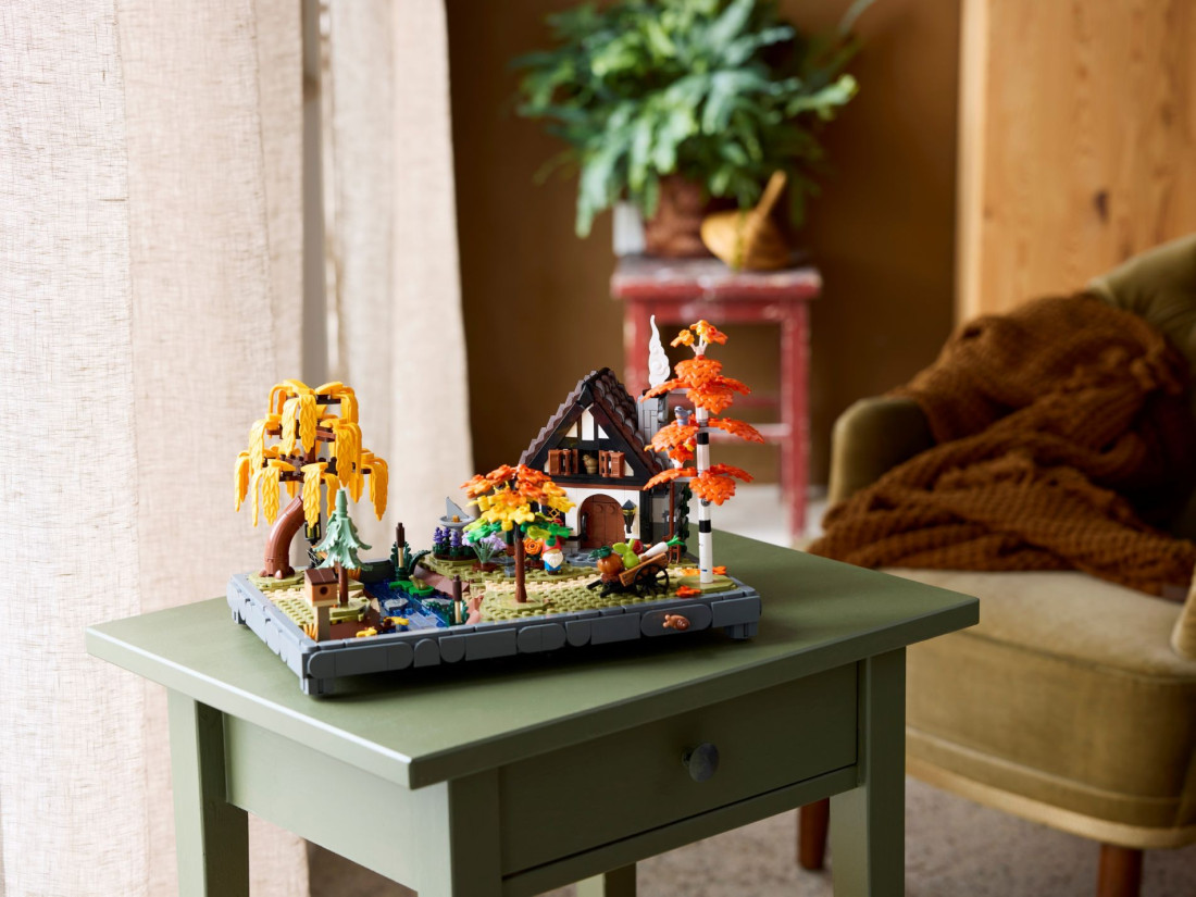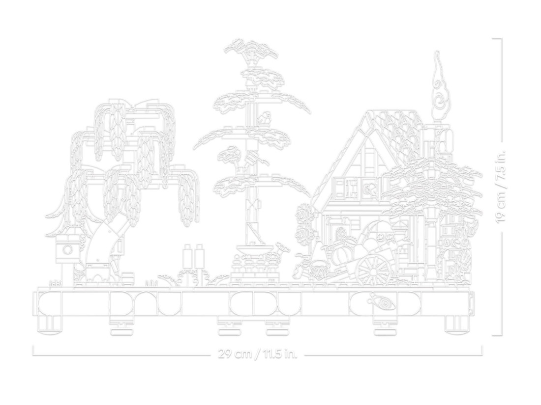 Модель містить будиночок із конструкцією, що відкривається, і затишною кухнею. Ділянку оформлено чотирма деревами — березою, плакучою вербою, блакитною ялиною та кленом — і доповнено сезонними насадженнями. Серед аксесуарів є сонячний годинник, будиночок для птахів, візок з овочами та садовий гном; між ступальними каменями тече струмок. Зустрічаються мініатюрні мешканці: малинівка, повзик, білка, жаба та равлик. 3D-інструкція доступна в додатку LEGO BUILDER; належить до колекції Gardens of the World. Габарити: 19 × 29 × 18 см; 1102 елементи; для дорослих.