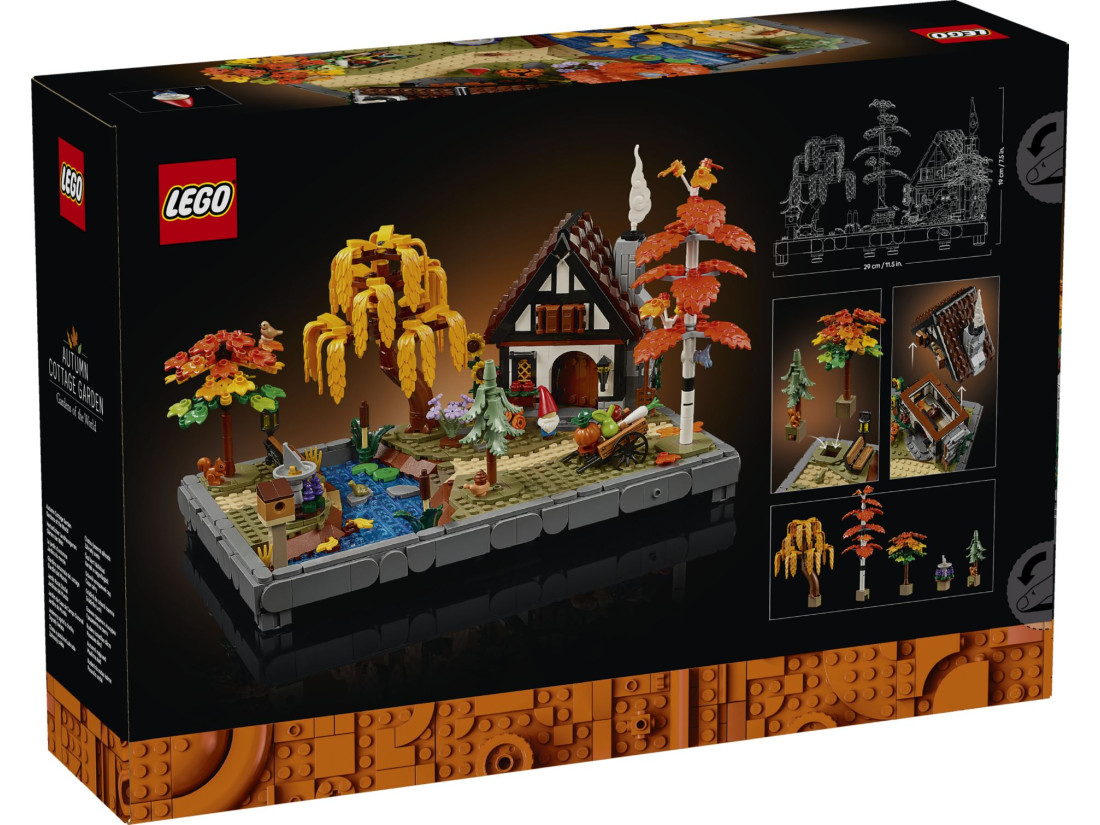 Набір LEGO ICONS «Осінній котеджний сад» (11372) — осіння сцена для дорослих, що передає атмосферу будиночка серед палаючого листя. Збирання розраховане на розмірений процес, а готова композиція підходить для експонування вдома або в офісі. Елементи ландшафту можна вільно переставляти, створюючи власний вигляд саду. Теплі відтінки цеглинок і дрібні деталі підтримують спокійну, медитативну атмосферу.