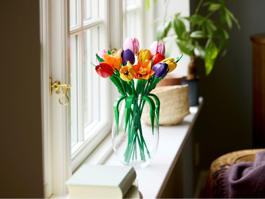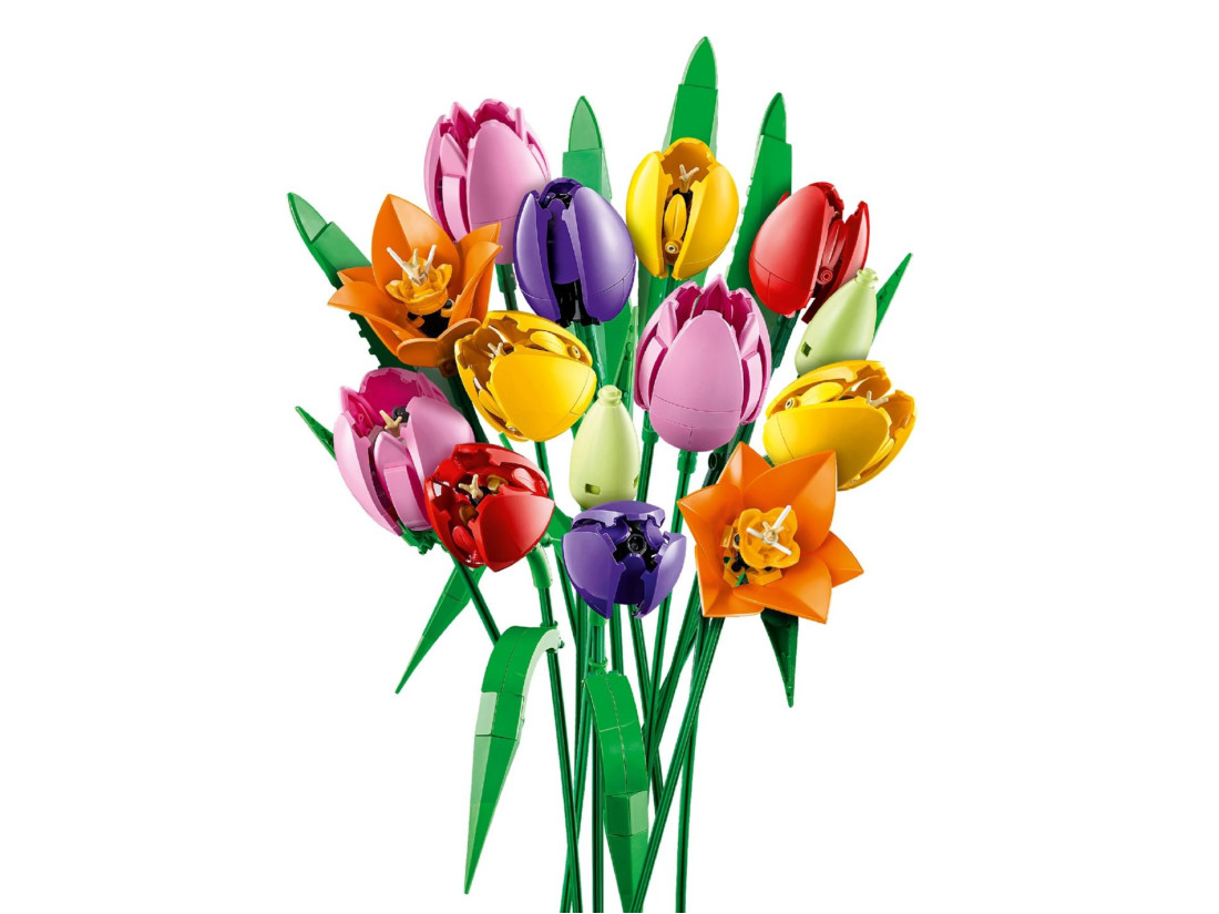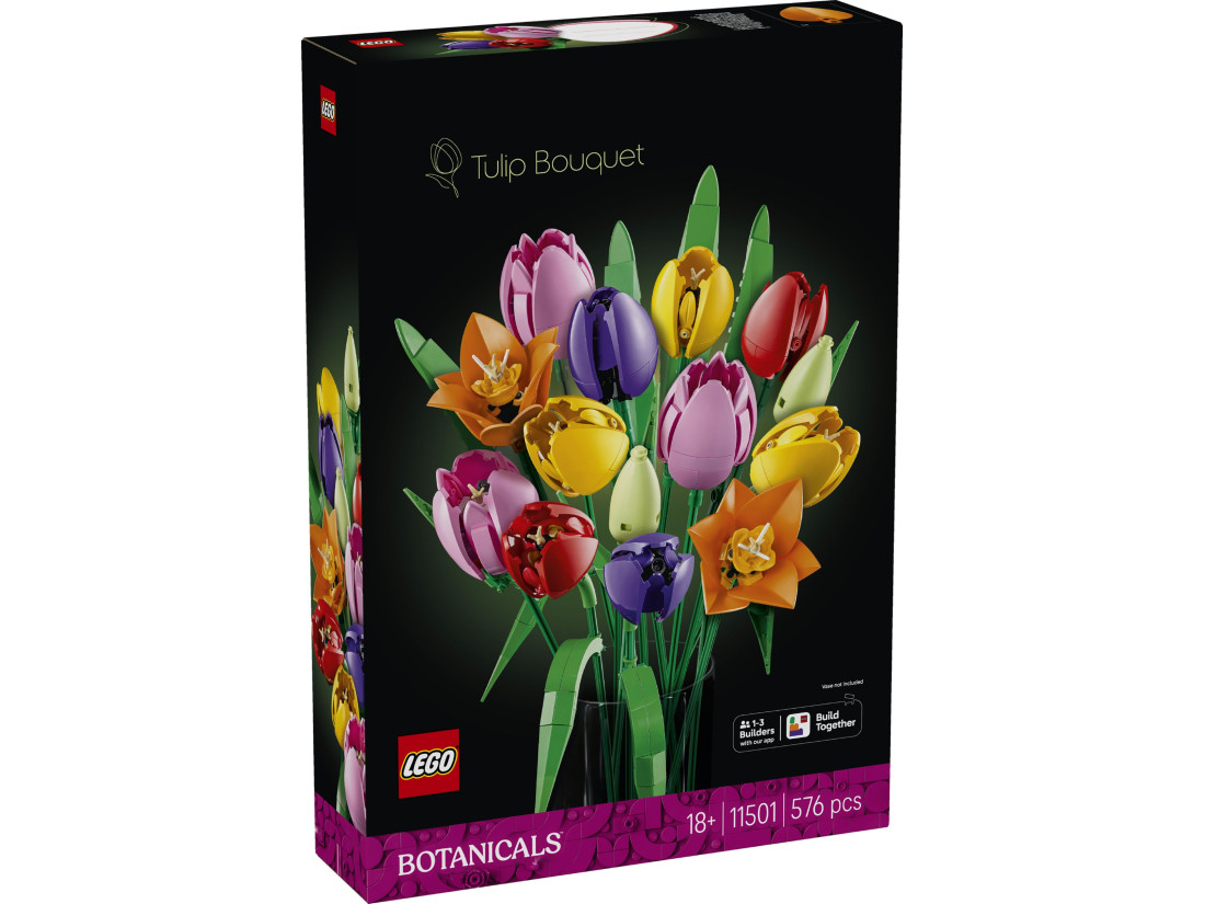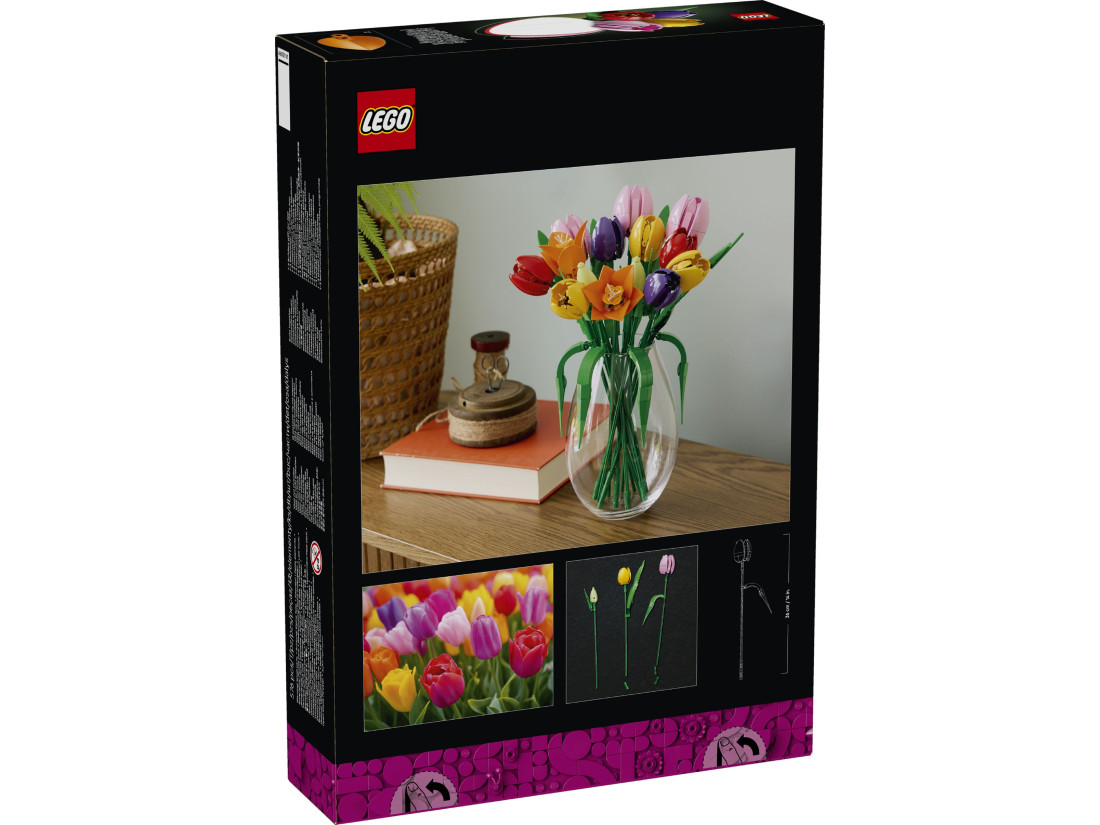 Усередині 576 деталей, з яких формуються п’ять варіантів тюльпанів: ніжні зелені бутони, закриті фіолетові квітки та повністю розквітлі червоні, жовті й рожеві. Регульовані за висотою стебла дозволяють варіювати силует і підібрати композицію під будь-яку вазу. Максимальна висота квітки — 36 см. Покрокові цифрові інструкції доступні в застосунку LEGO Builder. Модель стане символічним, нев’янучим подарунком на день народження, новосілля та інші особливі нагоди.