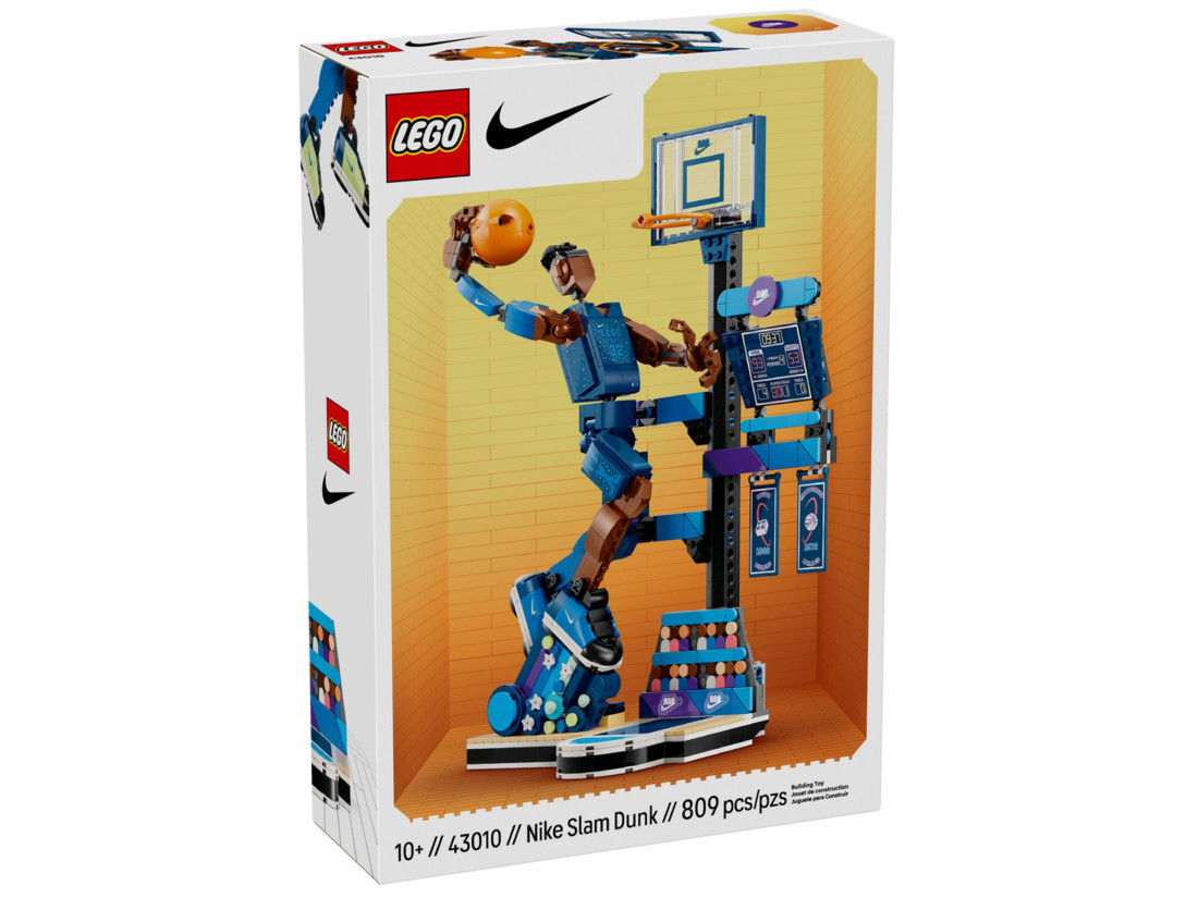 Набір LEGO Nike Slam Dunk (43010) пропонує зібрати динамічну баскетбольну сцену, у якій зафіксовано момент слем-данку. Конструкція поєднує ігрову та виставкову функції: кільце з сіткою, табло, чемпіонський банер і компактна трибуна формують атмосферу арени, а рухома фігурка гравця дозволяє виконувати кидок під різними кутами. Модель орієнтована на поціновувачів спорту, вуличної культури та колекційних експозицій.