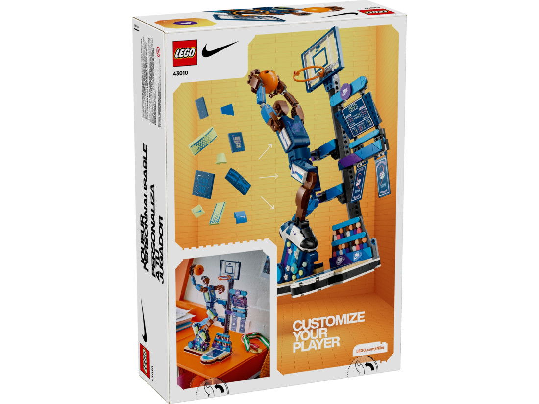 Створіть власного баскетболіста: регулюйте зачіску та номер, змінюйте оформлення форми Nike і варіанти шнурівки кросівок. Після складання сцена стає виразним елементом декору кімнати чи ігрової зони. Усередині — 809 деталей, серед яких приховані тематичні пасхалки для фанатів LEGO та Nike. Рекомендований вік — від 10 років; розміри зібраної моделі: висота 37 см, ширина 25 см, глибина 14 см.