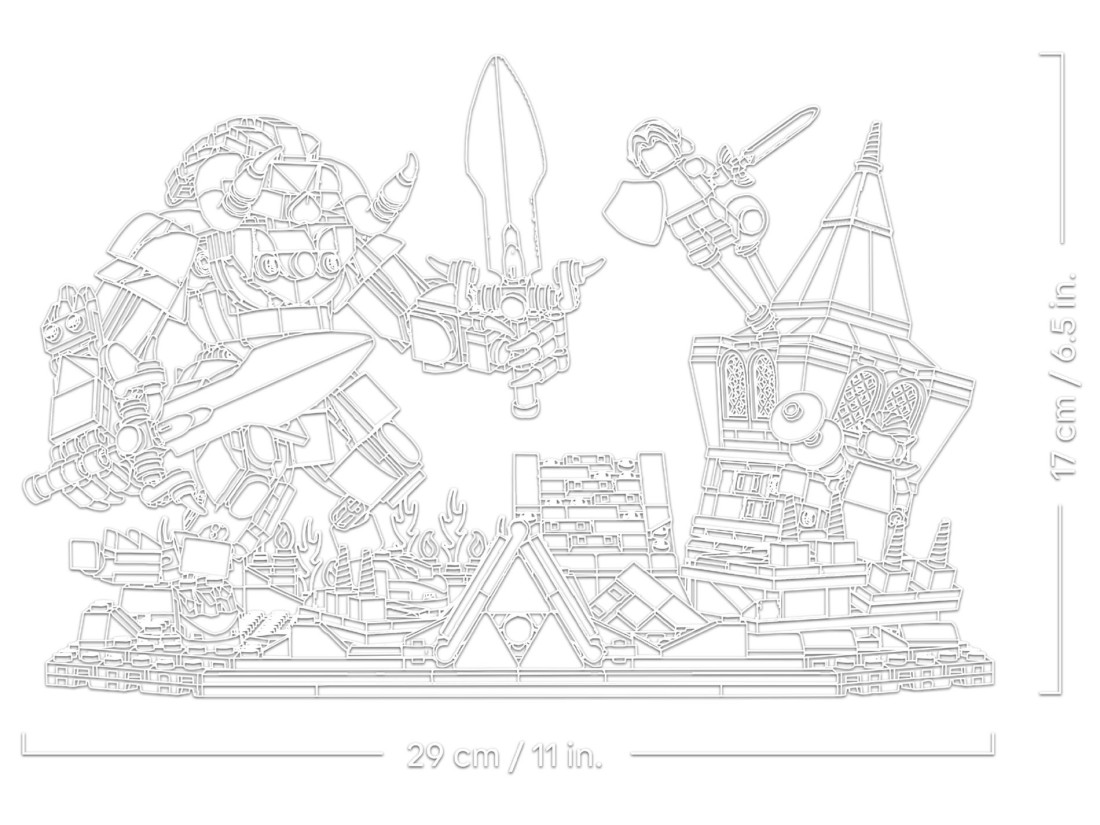 Композиція зображає зруйнований замок Ганона з вежею та обсипаними фрагментами мурування. Механізми оживляють діораму: натисканням з’являється Ганондорф, серед руїн приховано три серця відновлення, а у вежі знаходиться Молот Мегатона. У наборі мініфігурки Лінка, Зельди та Ганондорфа, збірна фігура Ганона і прозора фея Наві, а також Меч Майстра, Хайліанський щит, два тканинні плащі і два мечі для Ганона.