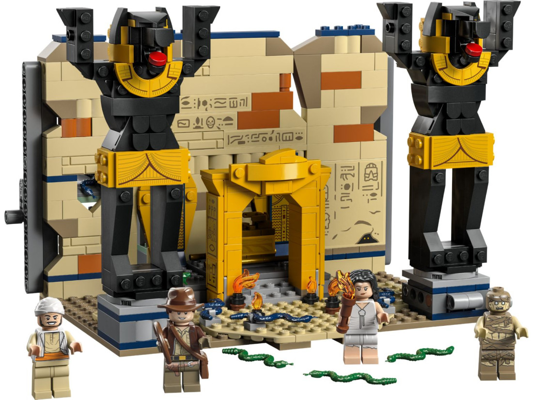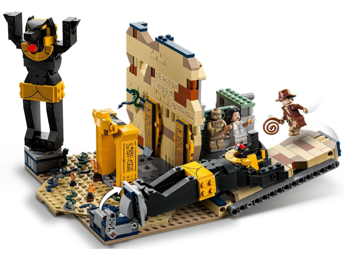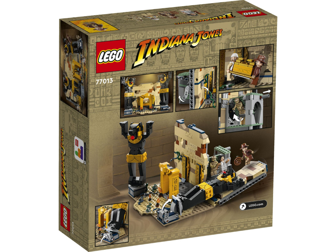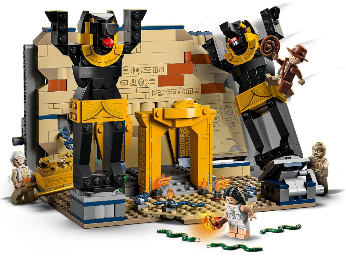 Конструктор LEGO Indiana Jones «Втеча із загубленої гробниці» (77013) відтворює момент із «У пошуках втраченого ковчега»: зал із давніми статуями, прихованими нішами та полчищами змій. Перекидна статуя Анубіса проламує стіну й відкриває таємний прохід, звідки з’являється мумія, додаючи динаміки грі. 600 деталей забезпечують цікаве складання та багаторазове розігрування сцен.